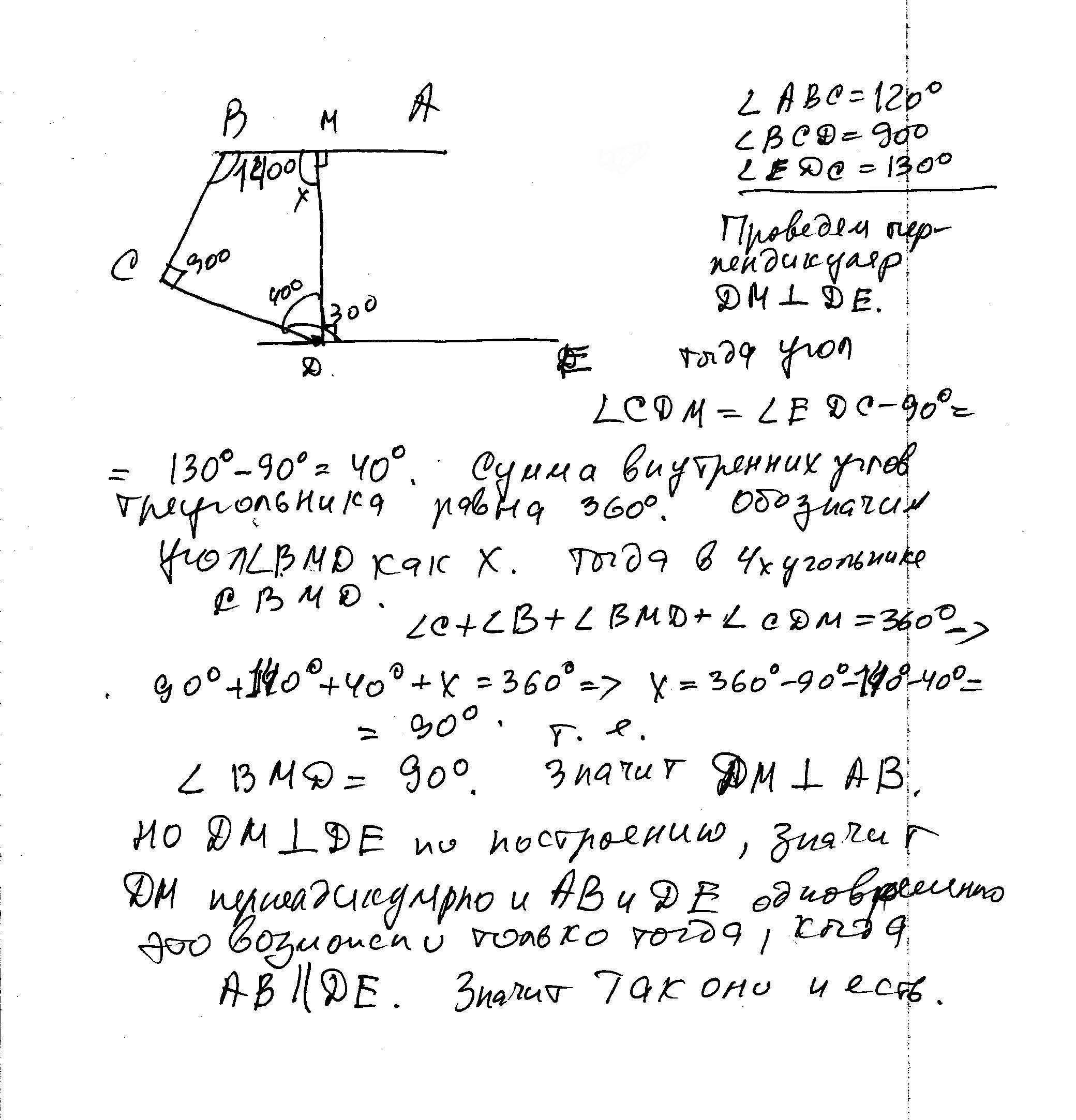 есть 2 прямые BA и DE есть точка C от D и B идут прямые к точке C получившиеся углы ABC=140 а EDC=130 BC перпендикулярна CD- я это понял так угол BCD=90 доказать что BA параллельно DE