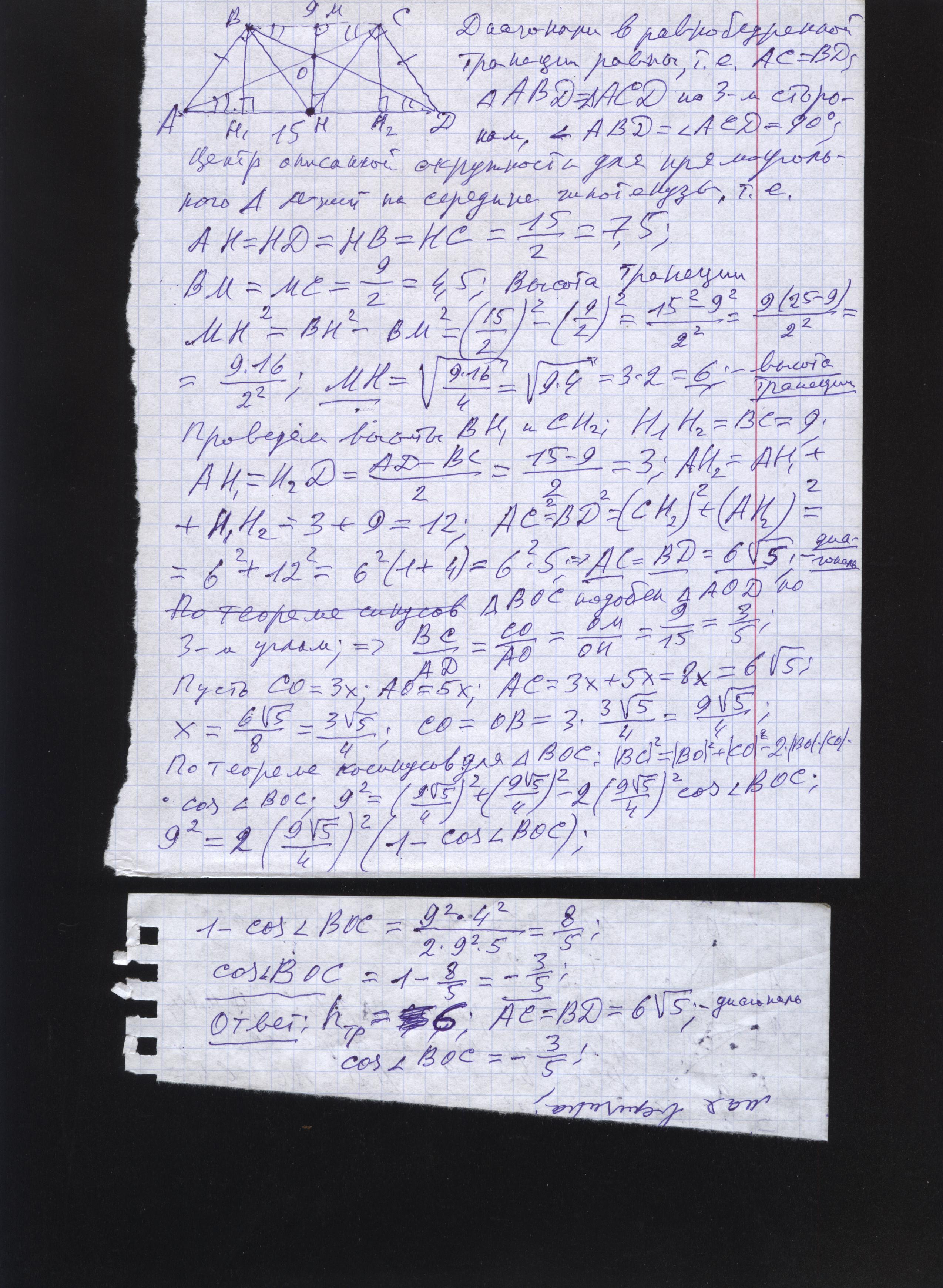 В равнобокий трапеции АВСD с основаниями ВС=9 и АD=15 диагональ АС перпендикулярна боковой стороне СD. Найти высоту трапеции, диагональ и косинус большого угла между диагоналями