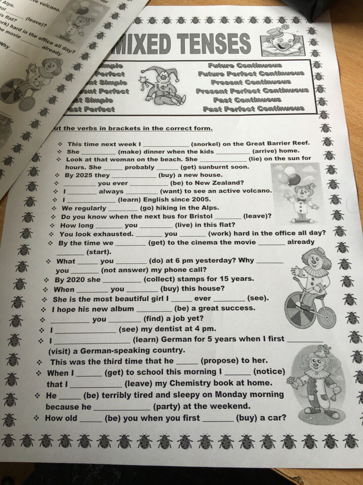 *I`ll be snorkeling;* She was making dinner when the kids arrived home. *She has been lying… She `ll have probably got…; * By 2025 they will have bought…; * Have you ever been… ; *I always want to see…; * I`ve been learning… ; *go ; *is leaving; * How long have you been living; * Have you been working; * By the time we get to the cinema the movie will have already started. *What were you doing; Why didn`t you answer; * she will have been collected; * What did you buy; * I have ever seen; *will be; *Have you found; * I will see; * I had been learning German for 5 years when I first visited; * proposed; *When I had got to school, I noticed, I had left; *He was, had had (had given) party; *were you, bought