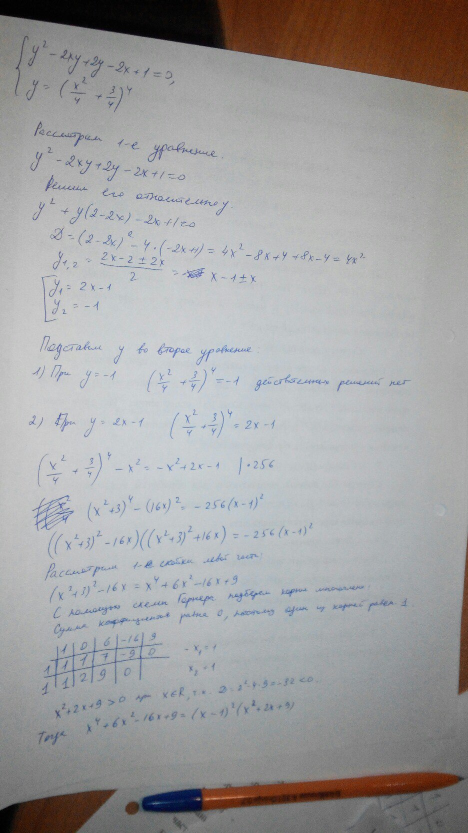 Спасибо большое. Я в первом уравнении вычислял дискриминант, в конце концов пришел к уравнению (2x-1)^(1/4)=x^2/4+3/4, которое решалось графически