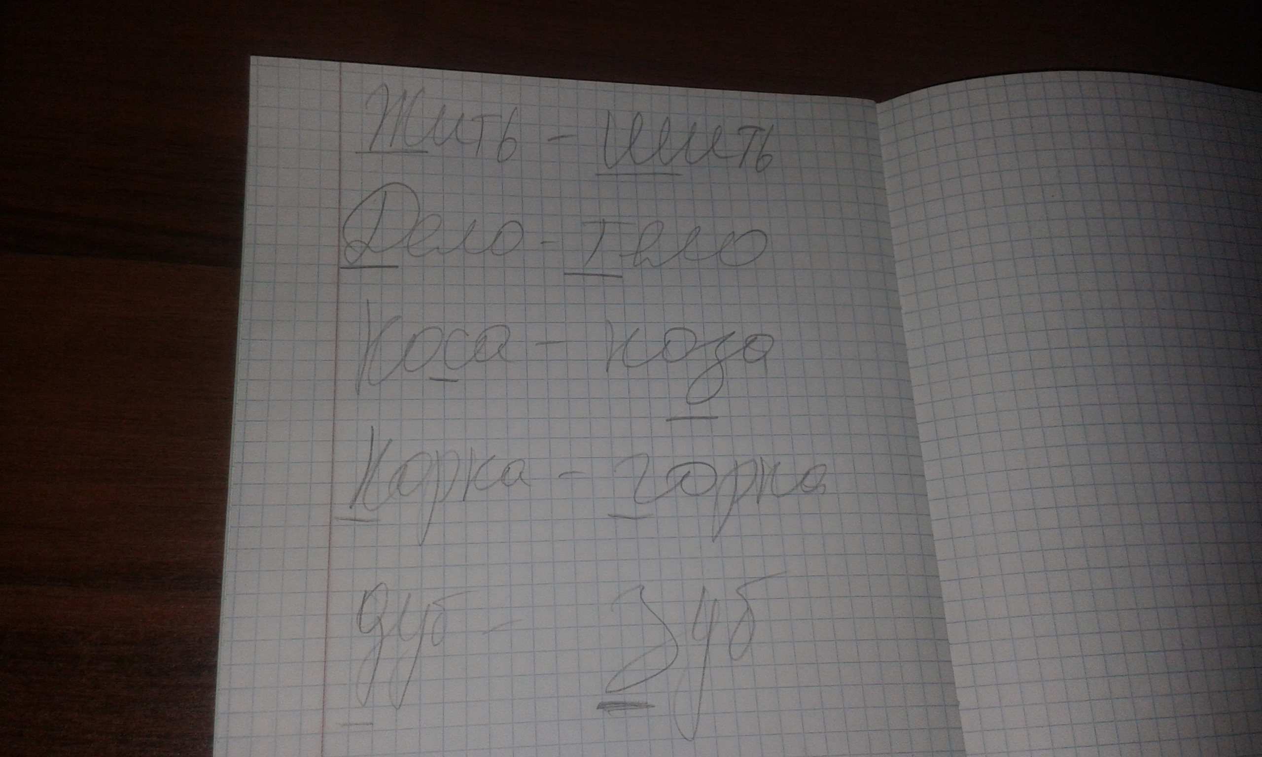 жить - шить, дело - тело, коса - коза, корка - горка, дуб - зуб.