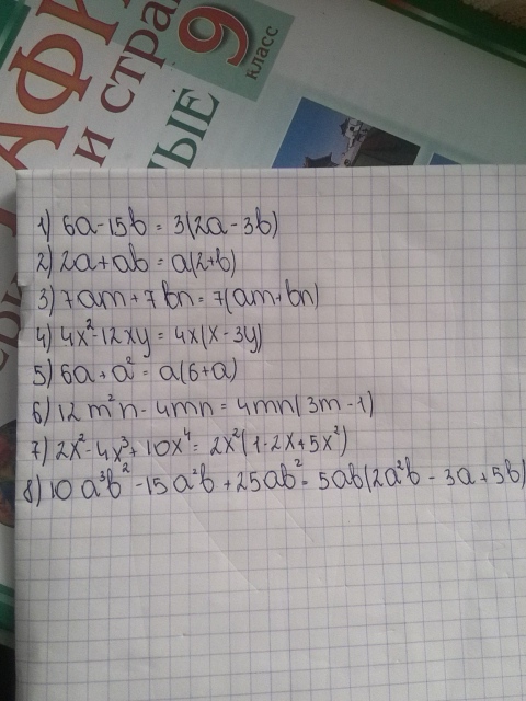 4) 4x²-12xy. 8) 10a³b²-15a²b+25ab²