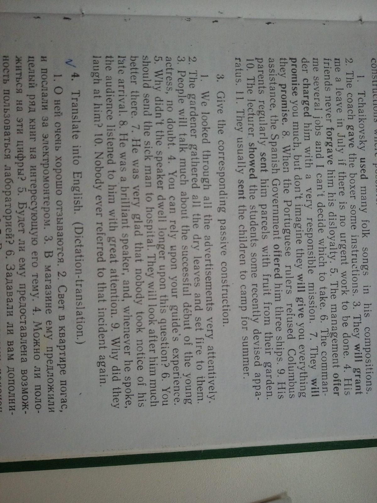 1. All advertisements were looked through very attentively by us. 2. All the dry leaves were gathered by the gardener and fire was set to them. 3. No doubt, the successful debut of the young actress will be talked about much. 4. Your guide`s experience can be relied upon. 5. Why this question wasn`t dwelled upon longer by the speaker? 6. The sick man should be sent to hospital by you. He will be looked after much better there. 7. He was very glad that his late arrival wasn`t taken notice to. 8….spoke, he was listen to the audience with great attention. 9. Why he was laughed at? 10. That incident was never referred to.