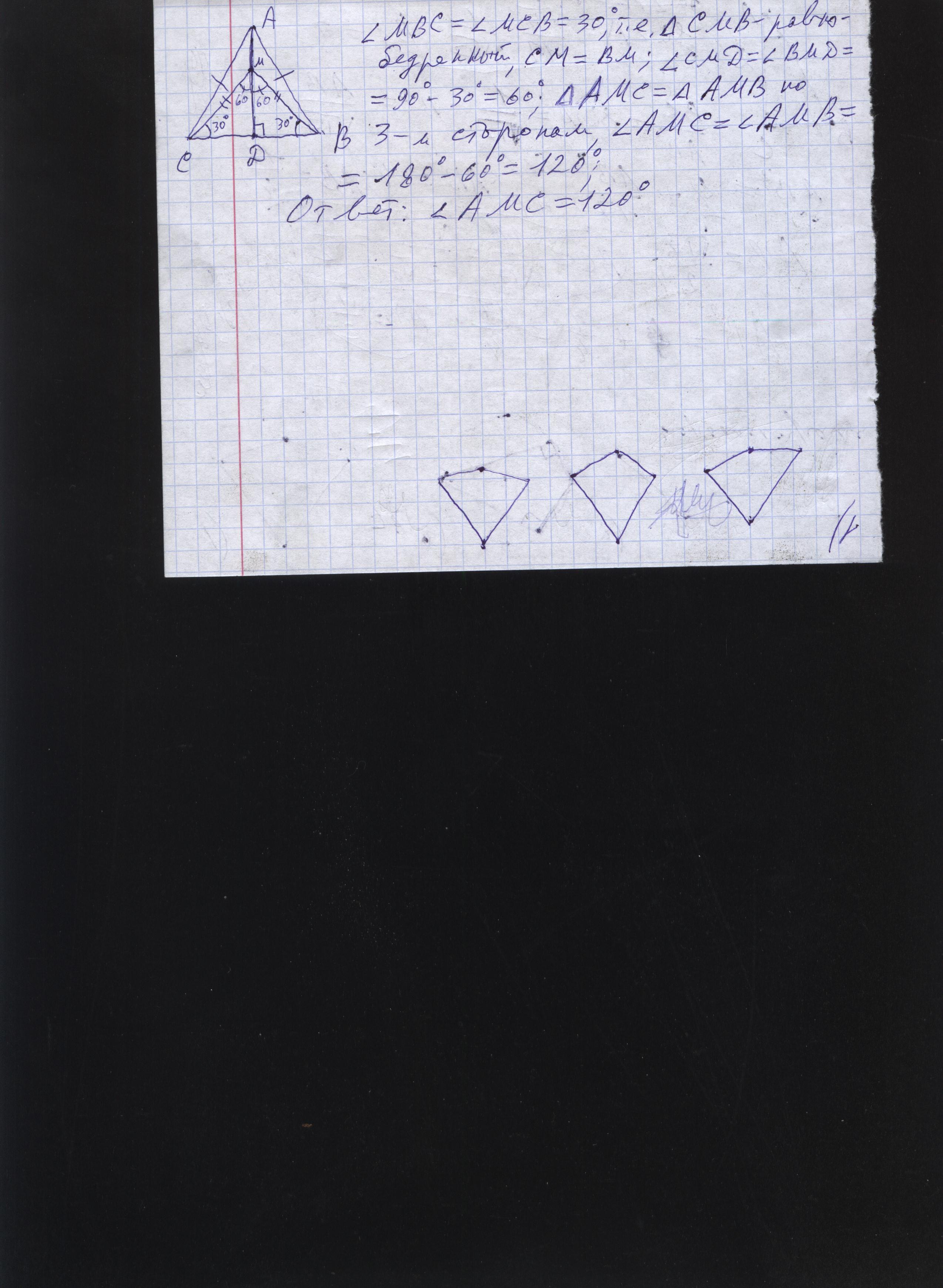 Внутри равнобедренного треугольника АВС с основанием ВС взята точка М такая, что угол МВС равен 30 градусов , угол МСВ равен 30 градусов. Найти угол АМС, если угол ВАС равен 80 градусов.