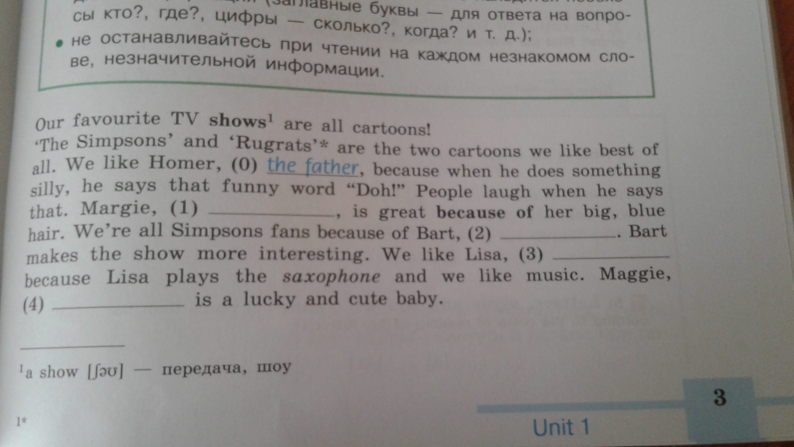 наши любимые передачи на тв - это мультфильмы. симпсоны и ох уж эти детки - это два мультфильма,которые мы любим больше всего.нам нравится Гомер, отец, потому что,когда он делает что-то глупое ,то говорит смешное слово Д'оу! люди смеются,когда он так говорит.Мардж ,__, великолепна своими большими синими волосами.все мы - фанаты Симпсонов из-за Барта, ___.Барт делает шоу более интересным.Нам нравится Лиза, ___,потому что она играет на саксофоне ,а мы любим музыку.Мэгги,___,везучий и милый ребенок.