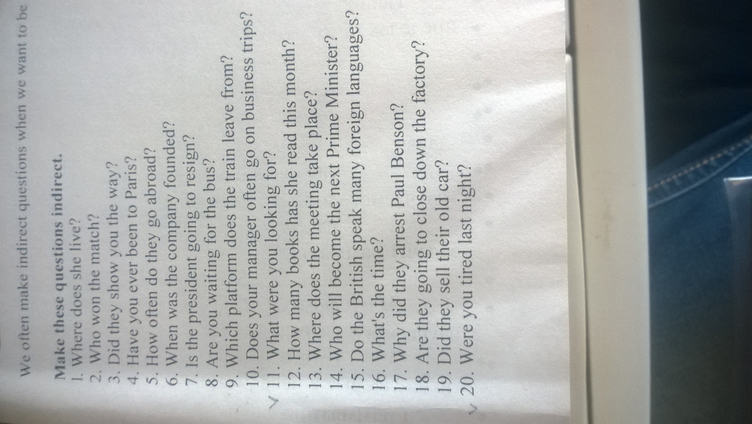 11. Say me, please, what you were looking for? 12. I`d like to know how many books she has read this month. 13. I inquire where the meeting takes place. 14. It`s interesting who will become the next Prime Minister. 15. I want to know if the British speak many foreign languages. 16. Do you know what time is? 17. I wonder why they arrested Paul Benson. 18. It`s interesting whether they going to close down the factory. 19. How do you thing if they sold their old car? I wonder if they were tired last night.