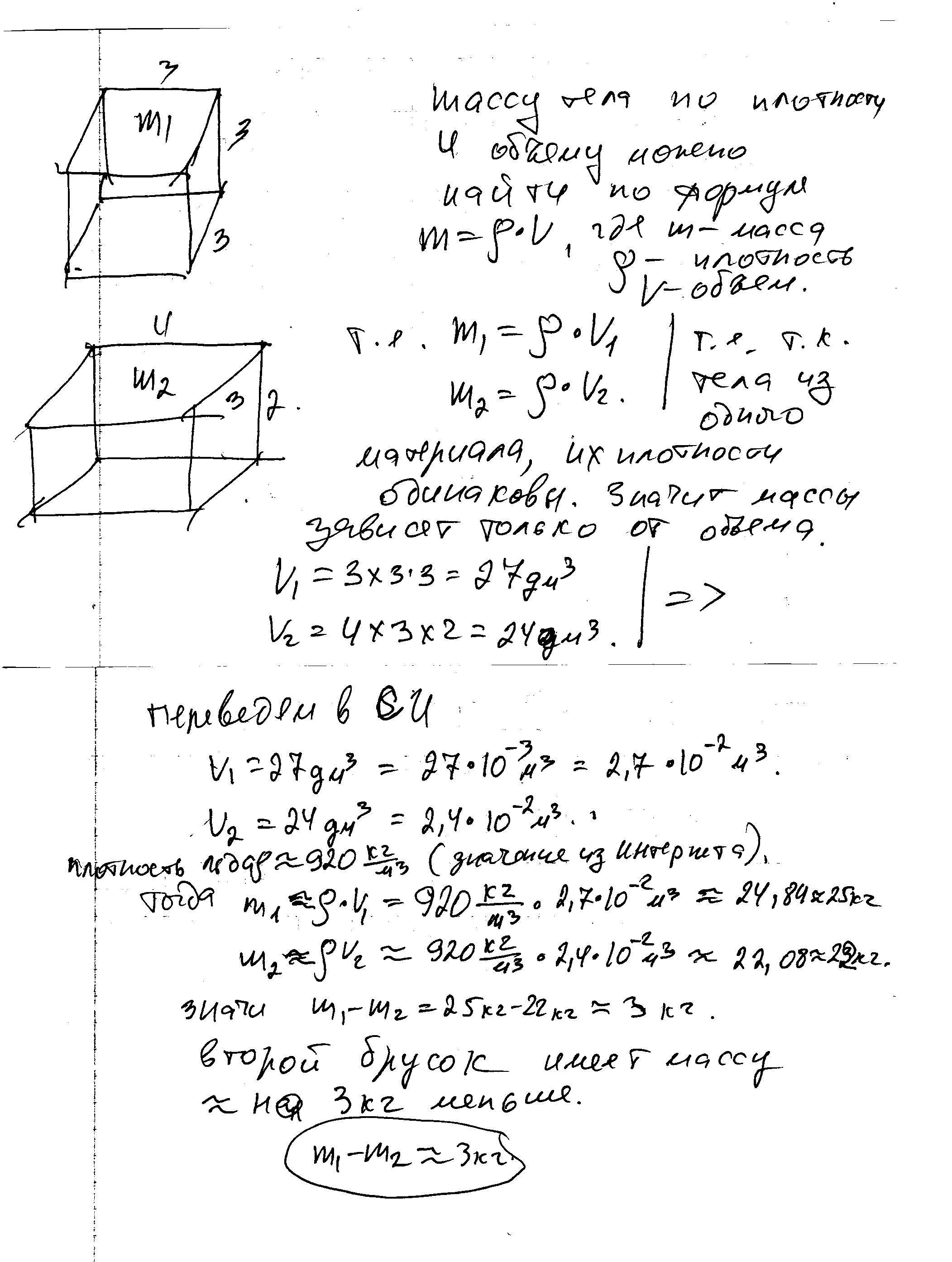 Имеются два ледяных бруска.Размеры первого бруска 3дм x 3 дм x 3 дм , размеры втррого 4дм x 3 дм x 2 дм .Масса какого бруска меньше и на сколько