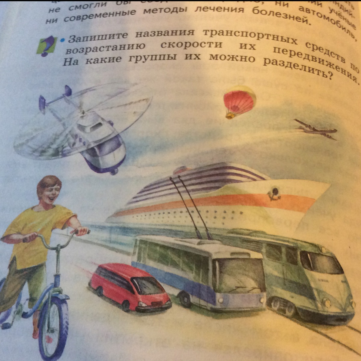 самолёт шар вертолёт это воздушные средства передвежиния. корабль ходит по воде . машина трамвай велосипед это на земные средства передвежиния