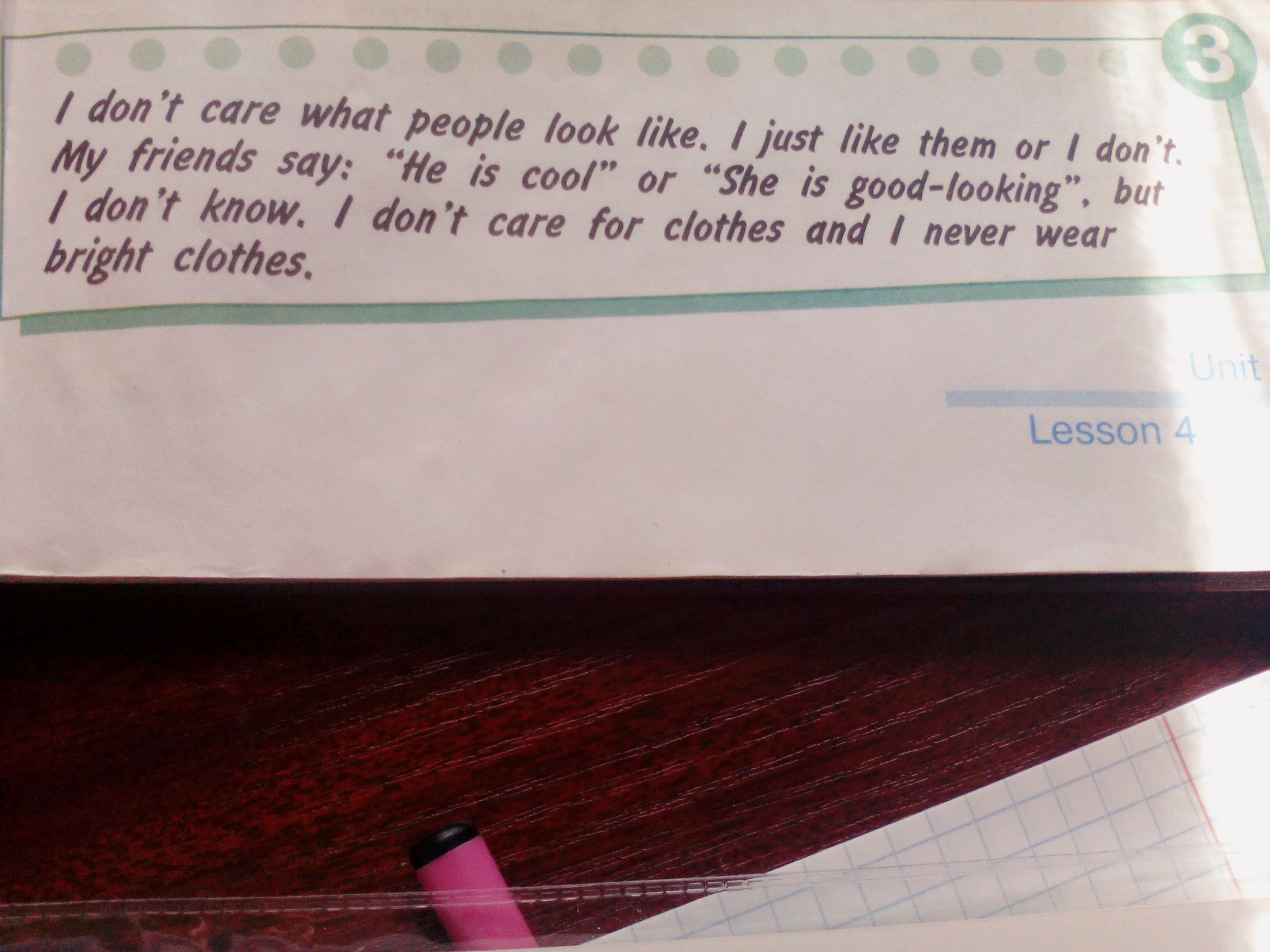 Мои друзья говорят " он крутой" или "Она хорошо выглядит" но я не знаю . Я не ухаживаю за одеждой и некогда не одеваю яркую одежду.