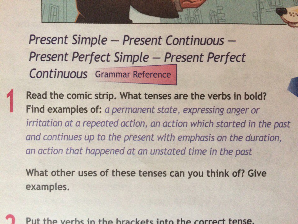 Нужно определить, какие времена имеют глаголы, выделенные жирным шрифтом, и найти примеры к "постоянное состояние, выразить свой гнев или раздражение на повторяющееся действие, и на действие, которое началось в прошлом, и продолжается до настоящего времени, в котором акцент на продолжительность, на действии, которое произошло в неустановленном времени, в прошлом. И сказать какие ещё применения этих времен можно придумать? Привести примеры. Первая фотография - само задание, вторая фотография - там глаголы, выделенные жирным шрифтом (are you talking. I,ve been studying. I,ve learn,t. He,s always lying. Спасибо, заранее!
