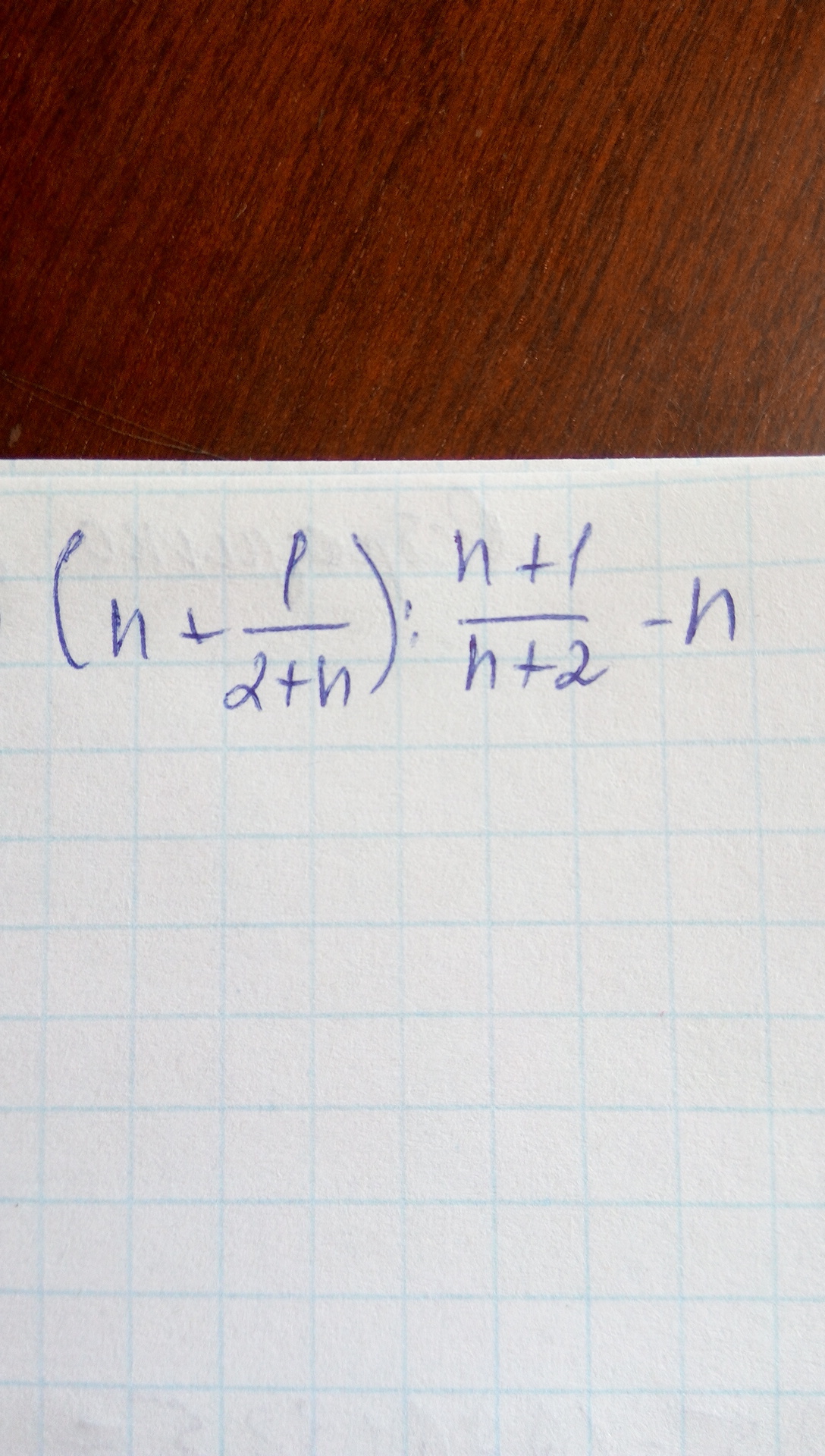 (n+ frac{1}{2+n}): frac{n+1}{n+2}-n= frac{n^2+2n+1}{n+2}: frac{n+1}{n+2}  -n=   frac{(n+1)^2*(n+2)}{(n+2)*(n+1)} -n=n+1-n=1.