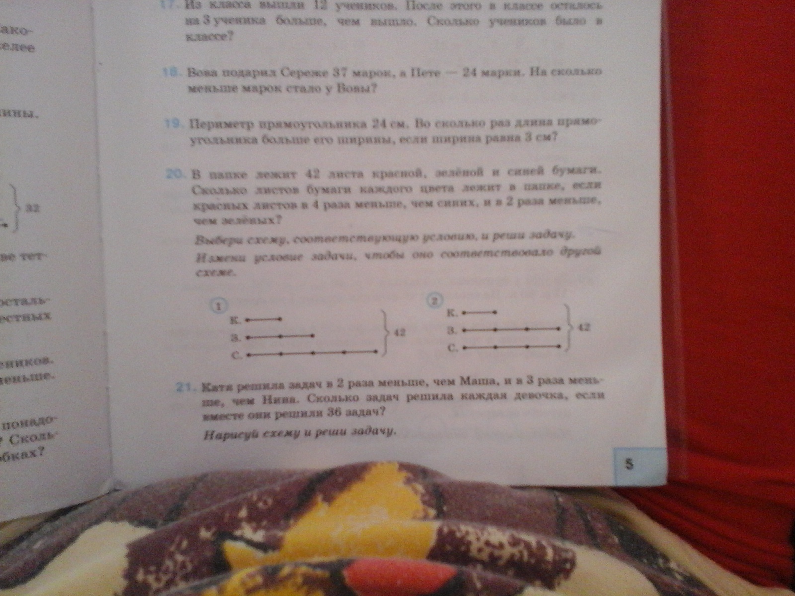 В папке лежит 42 листа трёх цветов: красного, зеленого и синего. Сколько листов каждого цвета в папке, если зеленых листов в три раза больше, чем зеленых, а синих и зеленых листов поровну?