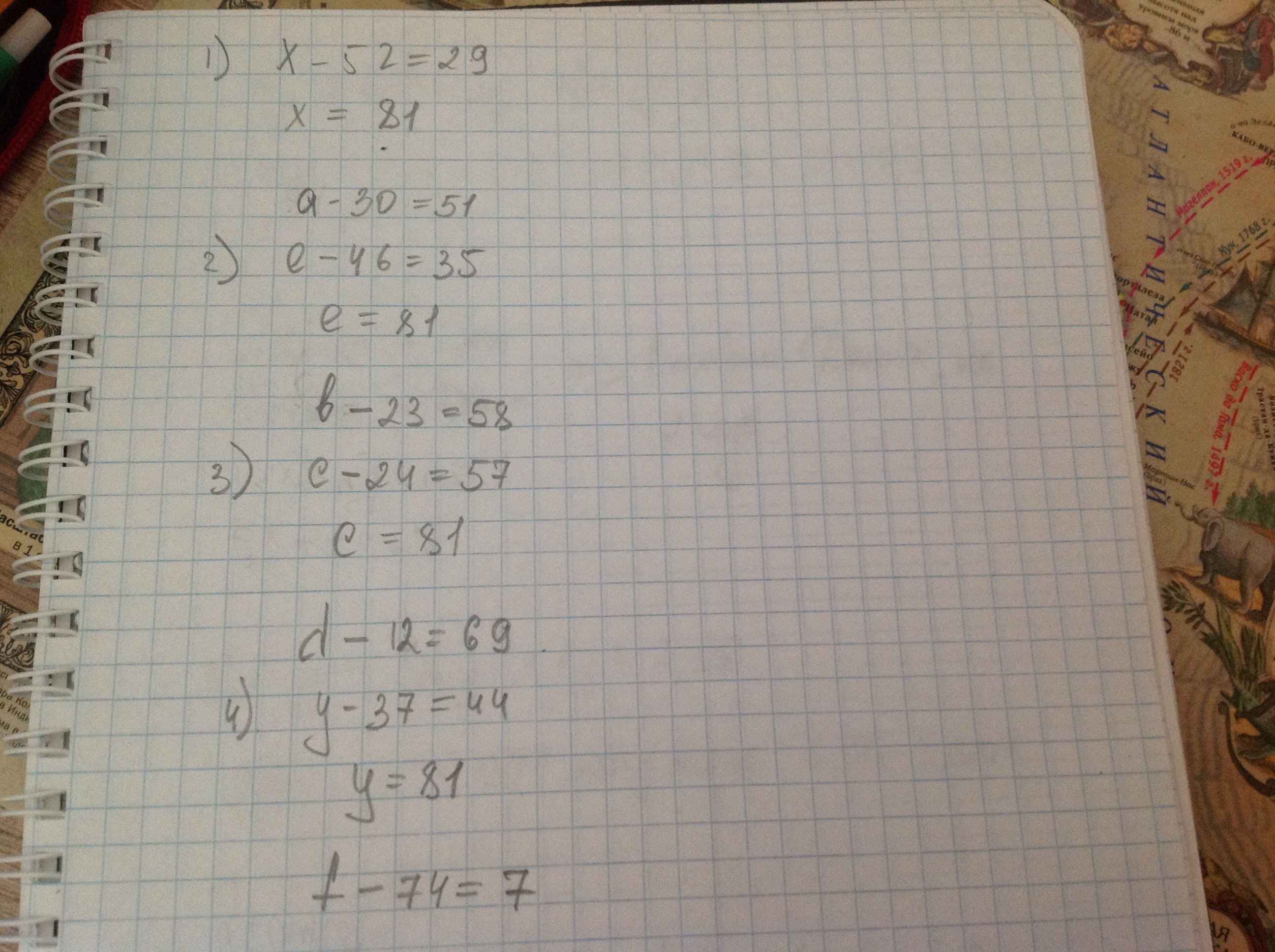 найди корни уравнений x-52=29,e-46=35,c=24=57,y-37=44. Запишите другие уравнения с неизвестным уменьшаемым, имеющие тот же корень.