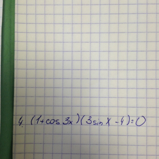 (1+cos3x)(3sinx-4)=0 \ 1+cos3x=0\cos3x=-1\3x= pi +2 pi n, nin Z  \ x= frac{ pi+2 pi n }{3} , nin Z  \  \ 3sinx-4=0\3sinx=4\sinx=1 frac{1}{3}  \ sinxin [-1;1] to sinx  neq 1 frac{1}{3}