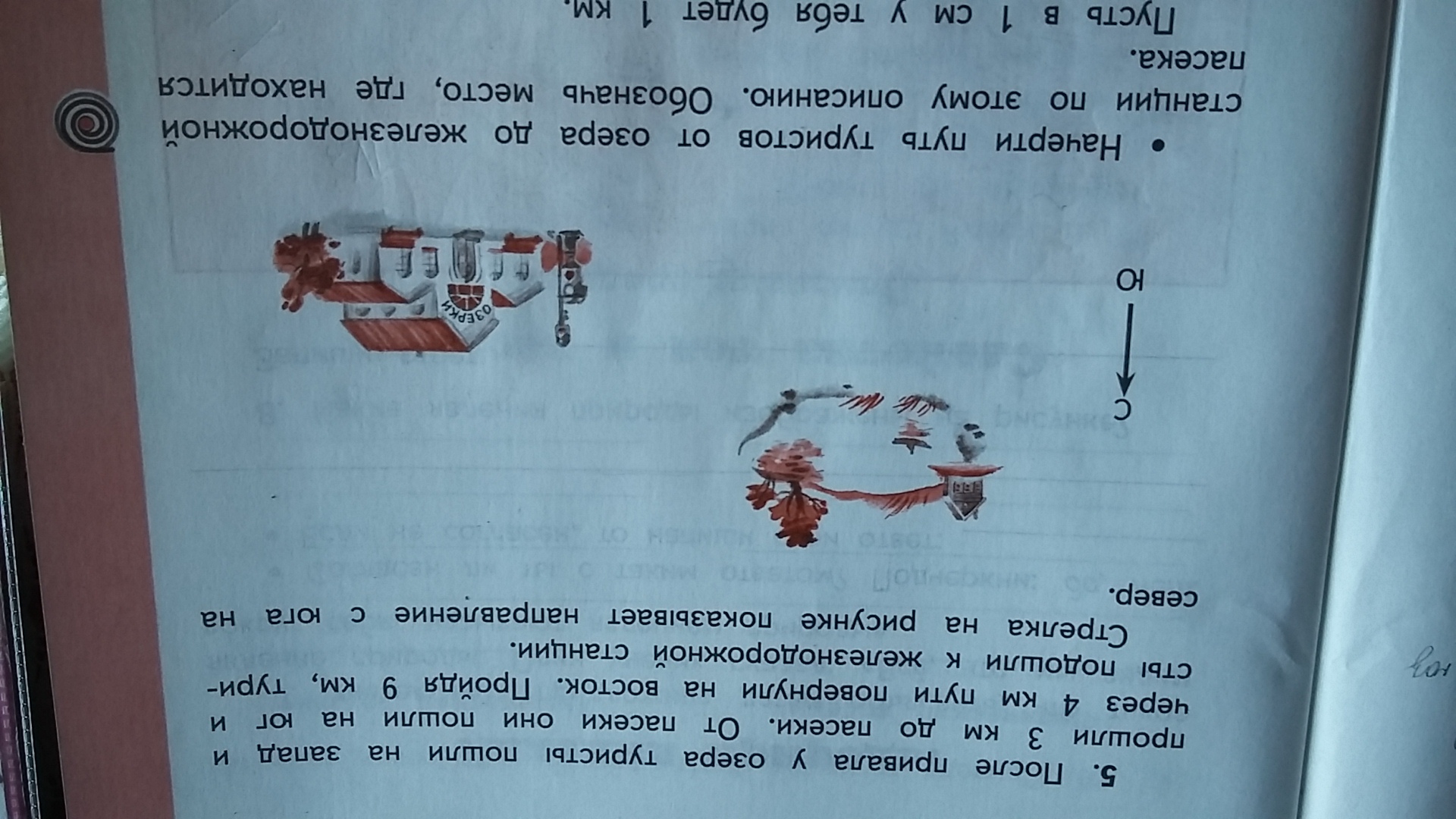 Начерти путь туристов от озера до железнодорожной станции по этому описанию. Обозначь место, где находится пасека