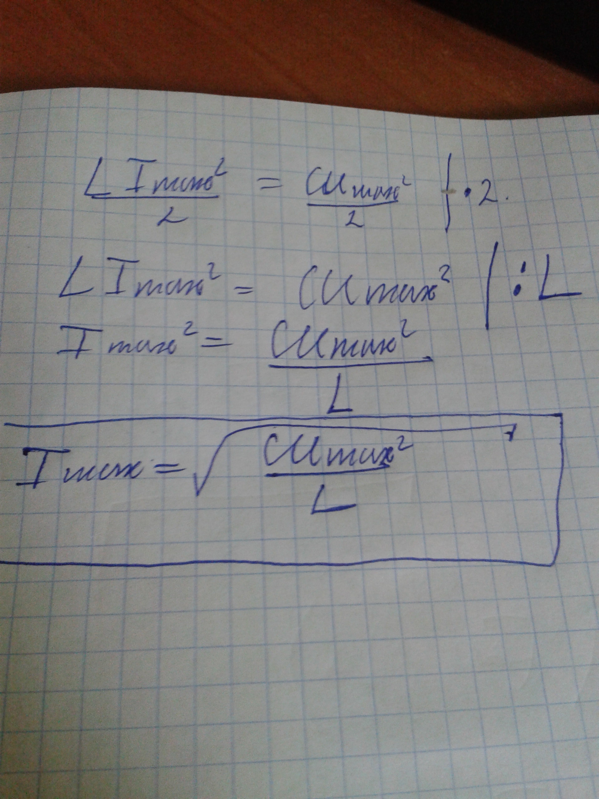 В левой части остаётся Imax^2. Чтобы был просто Imax, нужно взять квадратный корень.