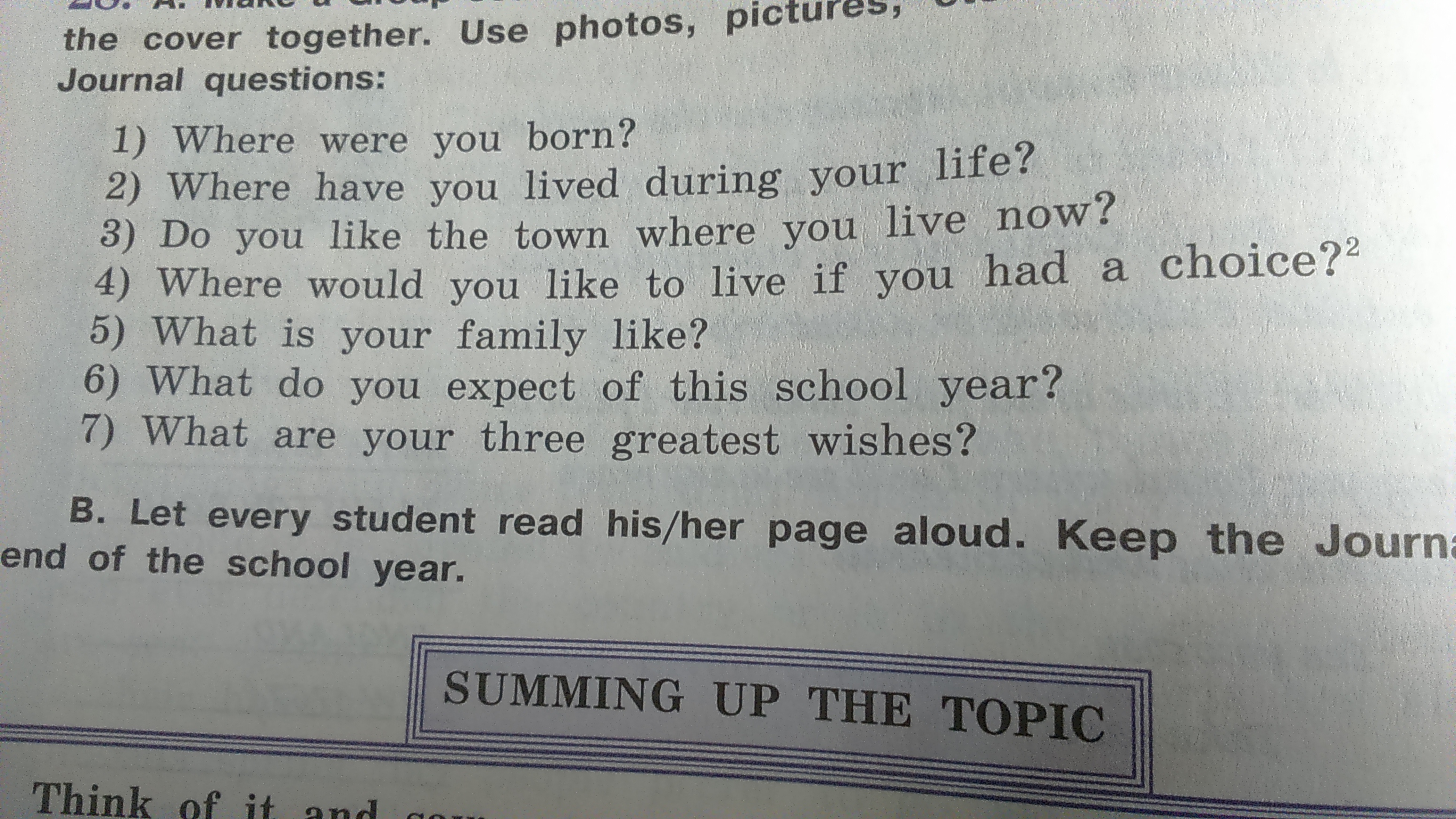 I was born in (твой город). I like this town because there are a lot of good people. If I have a chance I would like to live in London with my family. I love my family very much and they are mother, father and I. We like go to the theatre together every saturday