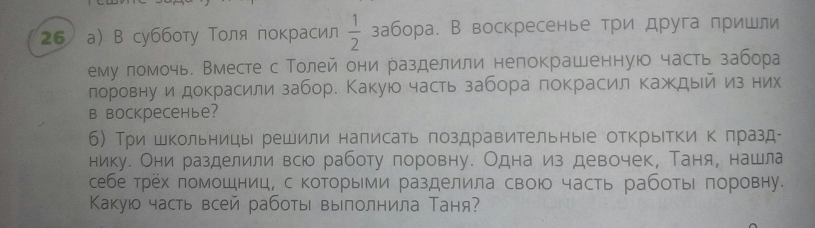 б)Три школьницы решили написать поздравительные открытки к празднику.Они разделили всю работу поровну, значит каждая из них взялась выполнить 13 всей работы.