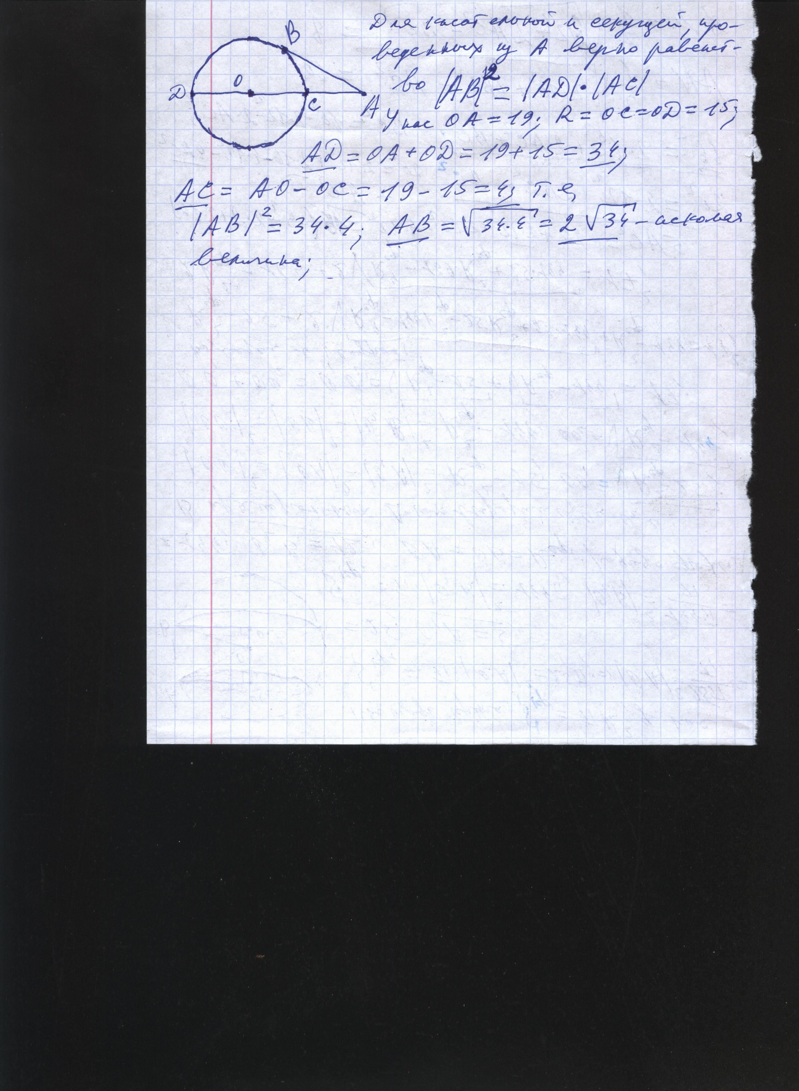 1) Прямая AB касается окружности с центром в точке О. ОА равно 19, радиус равен 15. Найди АВ.