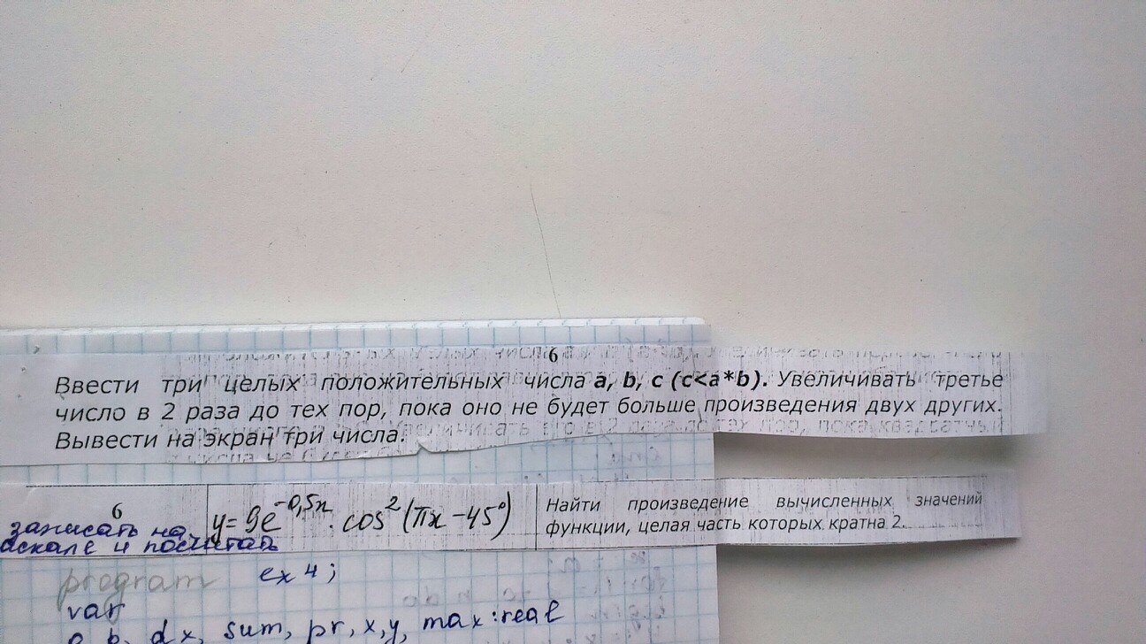 ПАСКАЛЬ АВС!!!Ввести три целых положительных числа a,b,c(c<a*b).Увеличить третье число в 2 раза до тех пор,пока оно не будет больше произведения двух других. Вывести на экран три числа)))) вторая задача на фотографии)