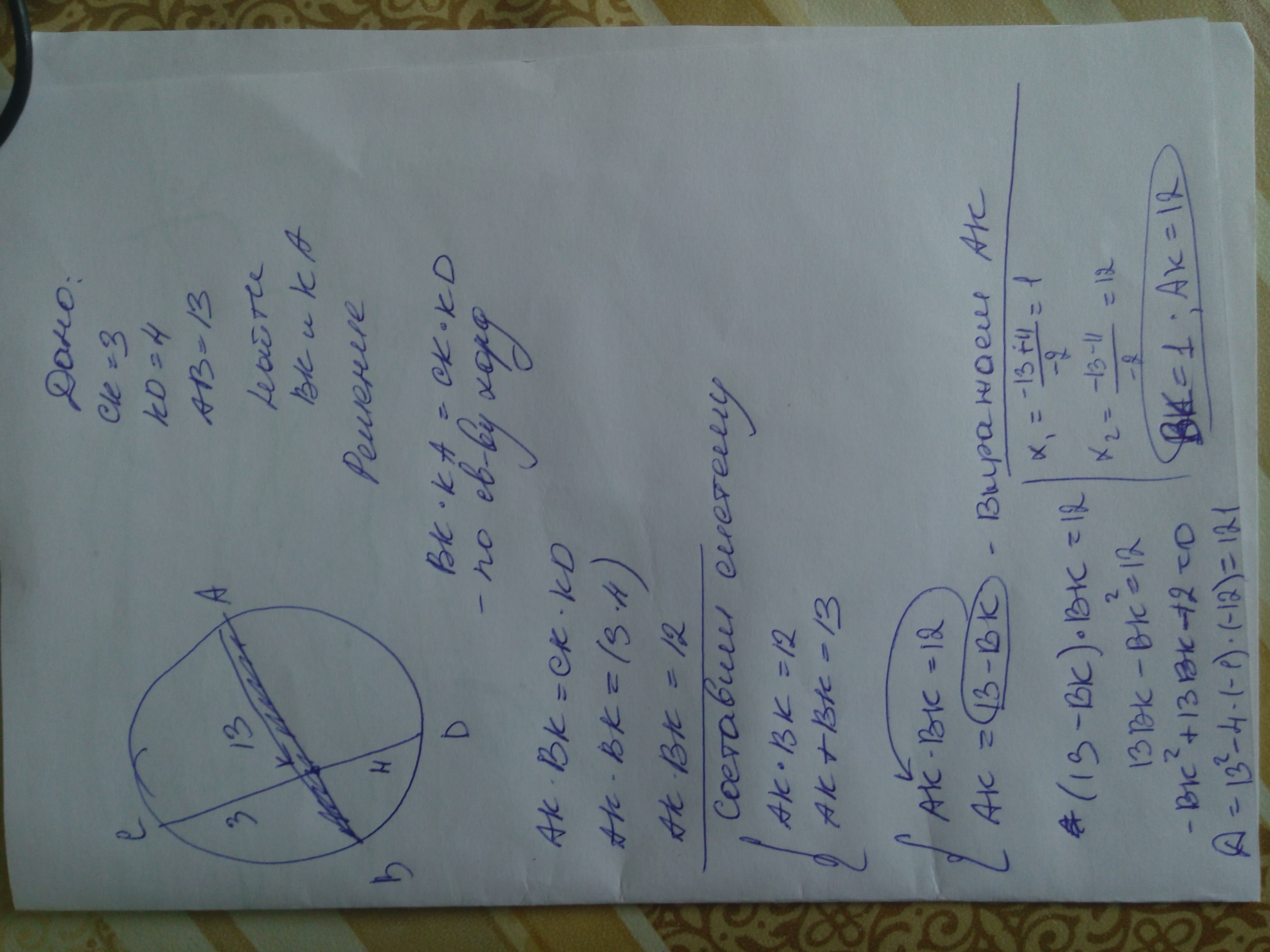 Хорды AB и CD Окружности пересекаются в точке К, АВ=13,СК=3,DK=4