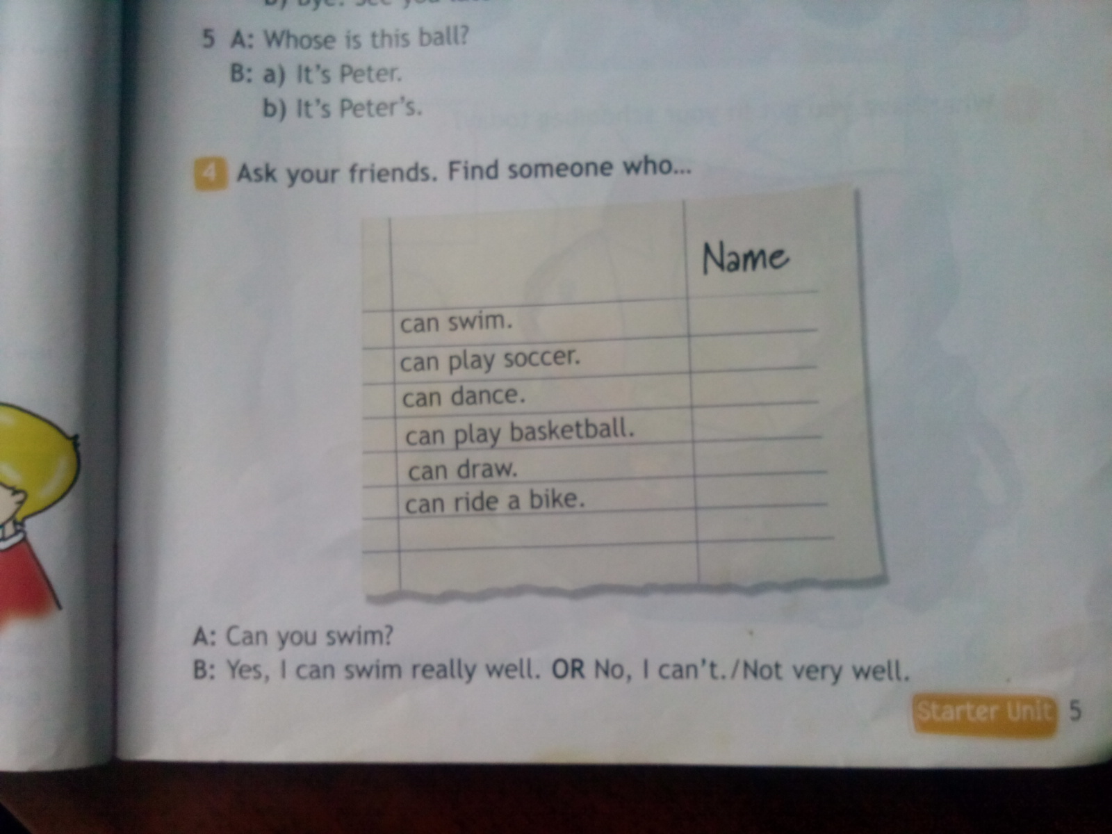 С учителлем мы так написали : canyuo swin? И рядом Yes, i can и ни каких имен!!!!