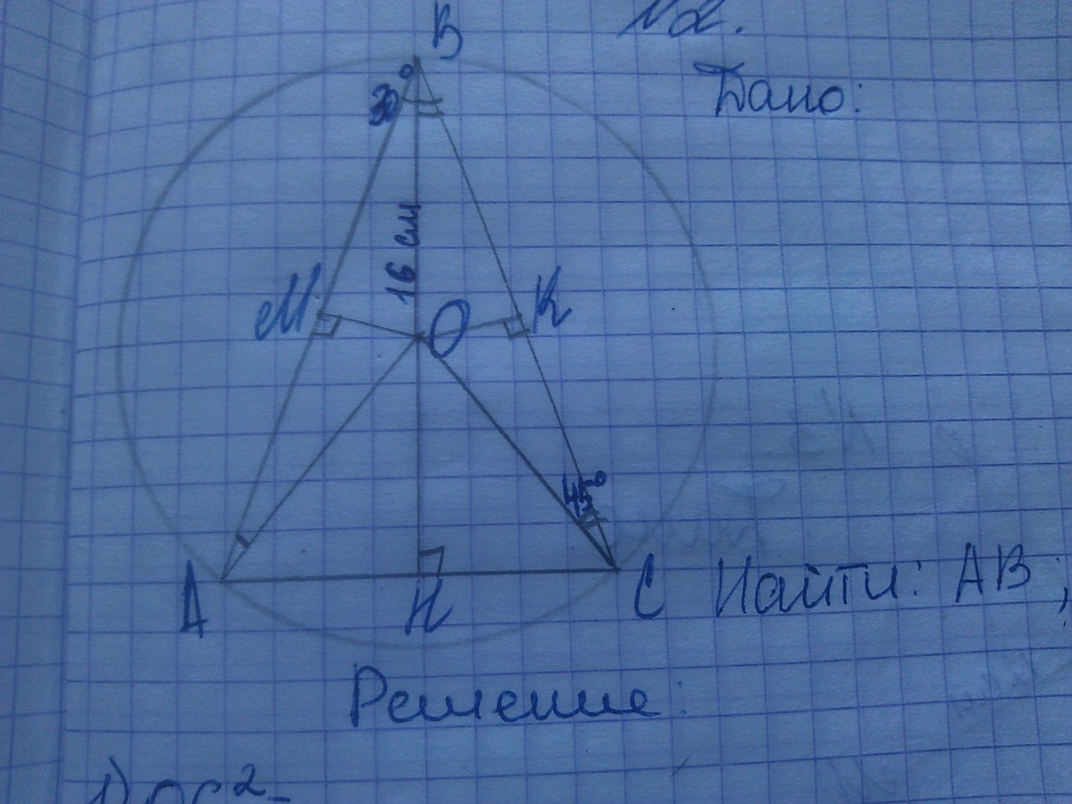 Окружность в центре О и радусом 16 см описана около треугольника АВС,так что угол ОАВ =30 градусов,угол ОСВ=45 градусов.Найти АВ и ВС в треугольнике АВС.