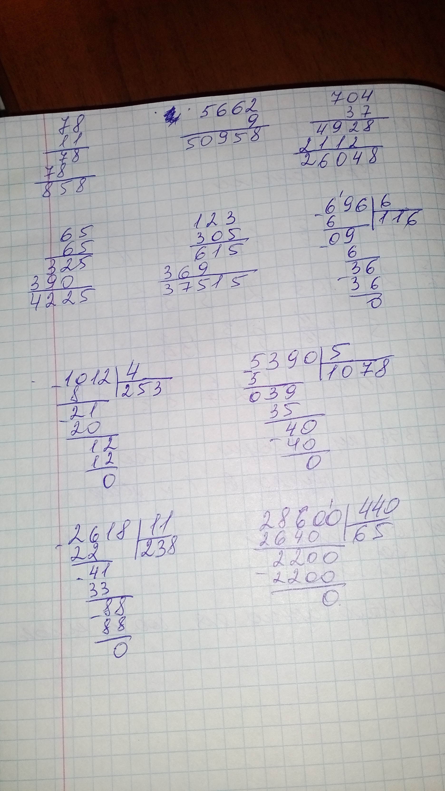 помогите решить примеры:1)78*11=....2)5662*9=.....3)704*37=....4)65*65=....5)123*305=....6)696÷6=.....7)1012÷4=.....8)5390÷5=(9)2618÷11=(10)28600÷440 в столбик