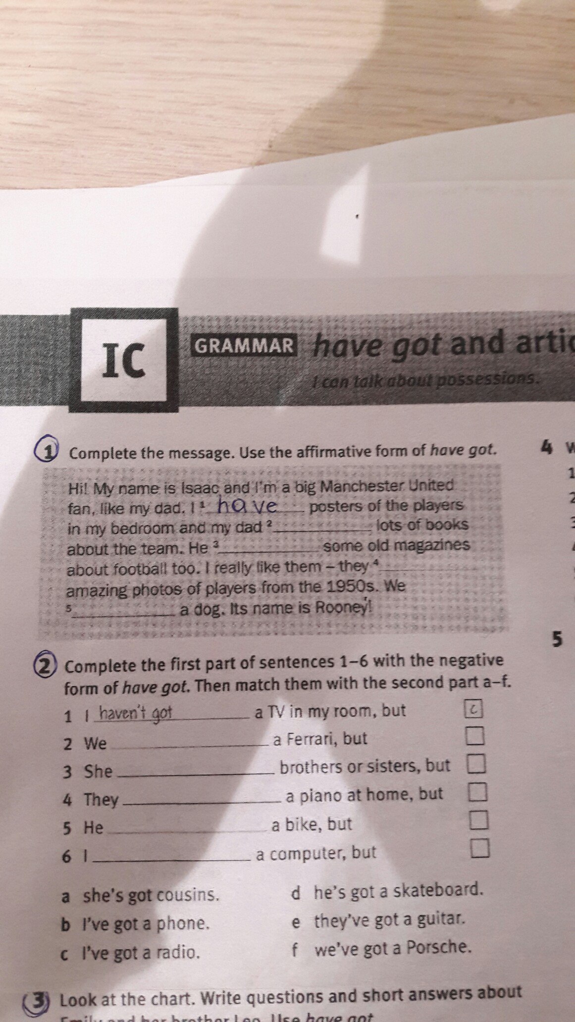 2)haven't got - f. 3)hasn't got - a. 4)haven't -e. 5)hasn't - d. 6) haven't got - b