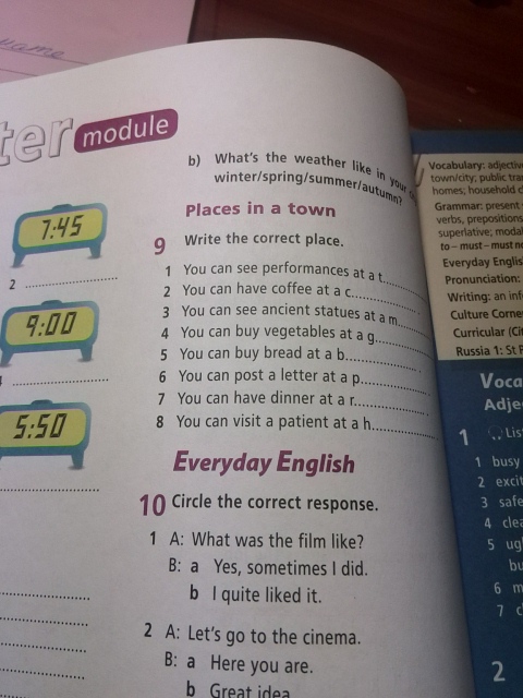 1)theater 2)cofee 3)museum 4)grocery 5)bakery/grocery 6)post office 7)restaurant 8)hospital вроде так