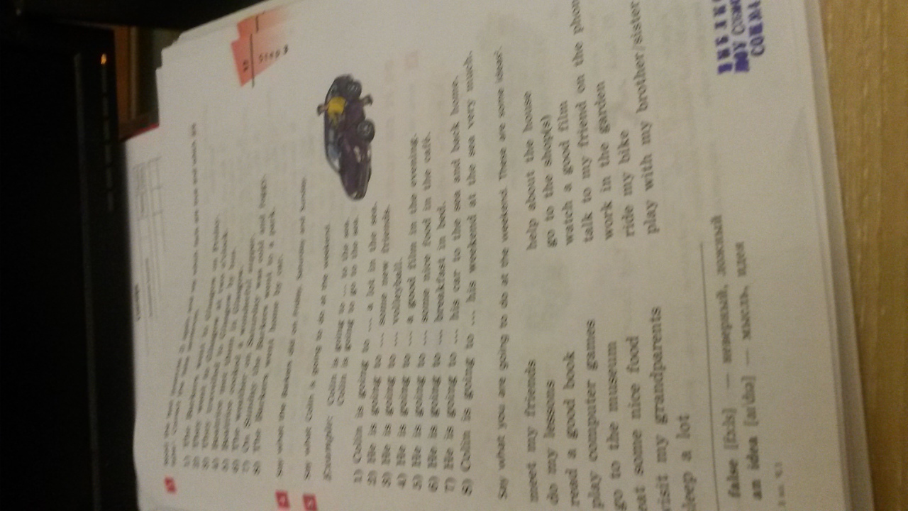 5.say what colin is going to do at the weekend. 1)colin is going to ... a lot in the sea. 2)he is going to ... some new friends. 3)he is going to ... volleball. 4)he is going to ... a good film in the evening. 5) he is going to ... some nise food in the cafe. 6) he is going to ... breakfast in bed. 7) he is going to ... his car to the sea and back home. 8)colin is going to ... his weekend at the sea very much. Сделайте быстро!!пж!!!