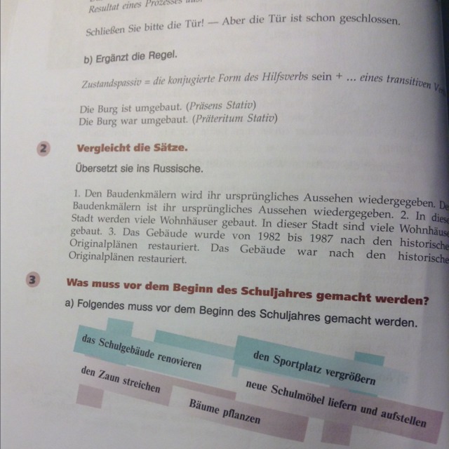 Das Schulgebäude muss renoviert werden. Der Sportplatz muss vergrößert werden. Neue Schulmöbel müssen geliefert und aufgestellt werden. Der Zaun muss gestrichen werden. Bäume müssen gepflanzt werden.