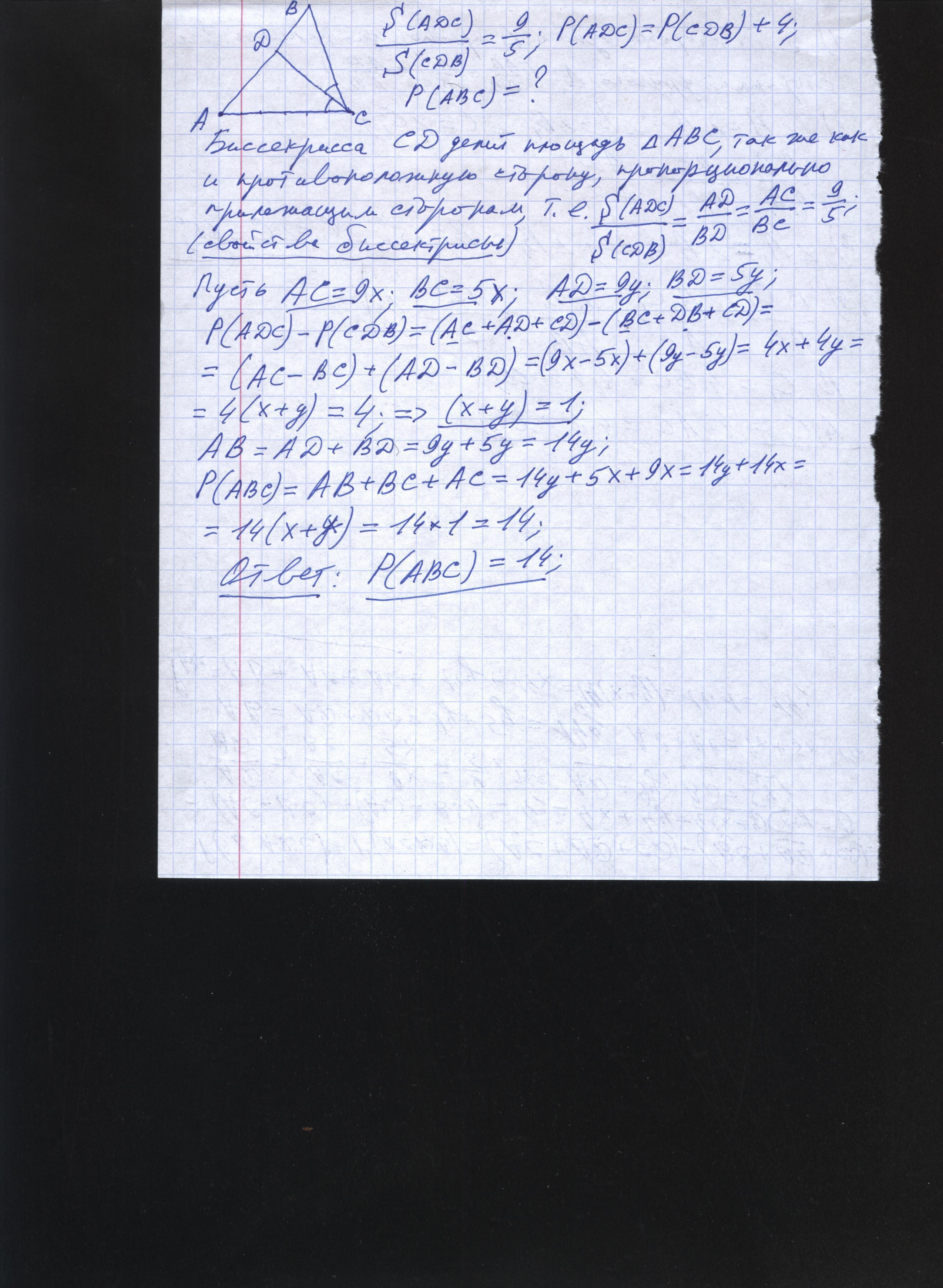 В треугольнике ABC проведена биссектриса CD. Площади треугольников ADC и CDB относятся как 9 : 5. Периметр
