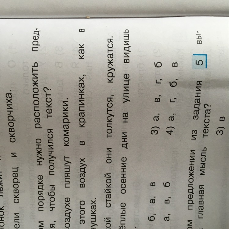 В каком порядке нужно записать предложением)в воздухе пляшут комарики.б)от этого воздух в крапинках, как в веснушках.в)лёгкой стайкой они толкутся кружатся г)в тёплые осенние дни на улице видишь чудо