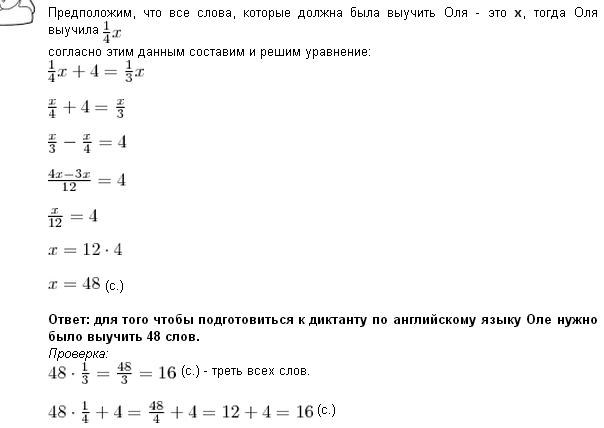 Оля выучила четверть слов а если бы она выучила ещё 4 слова то она бы выучила треть слов сколько слов выучила оля
