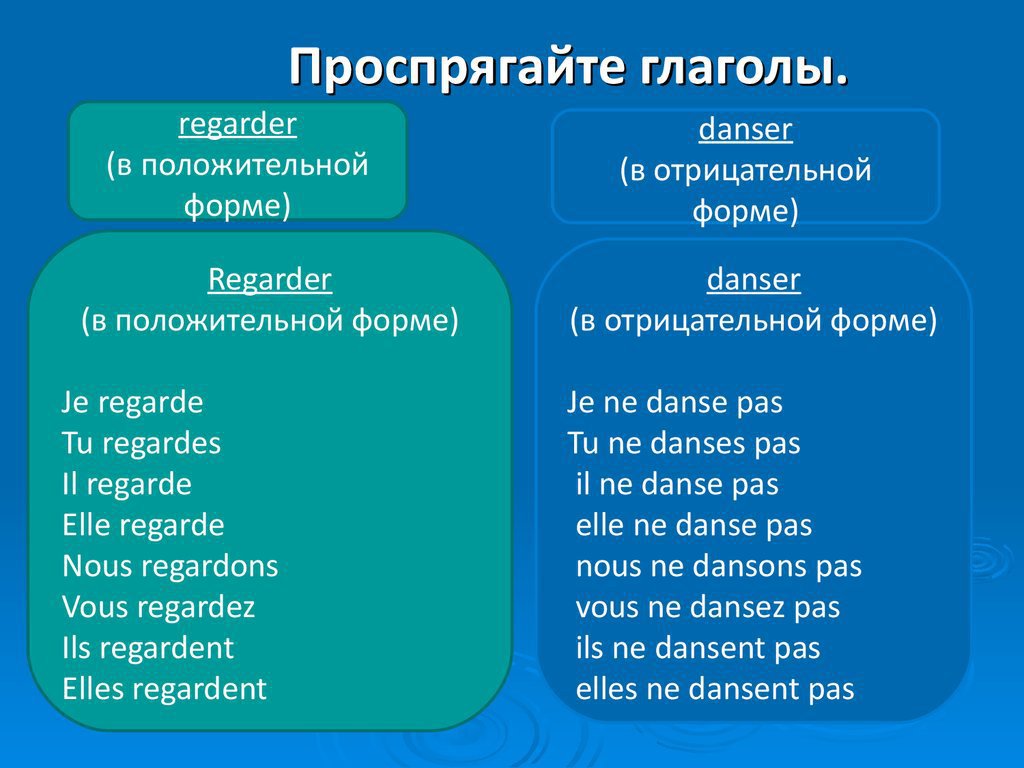 все глаголы, оканчивающиеся на er-первой группы на картинке номер три будет подробный разбор глагола "смотреть" там есть и глагол "танцевать" в отрицательной форме там меняется только основа глагола, окончание же остаётся неподвижным.
