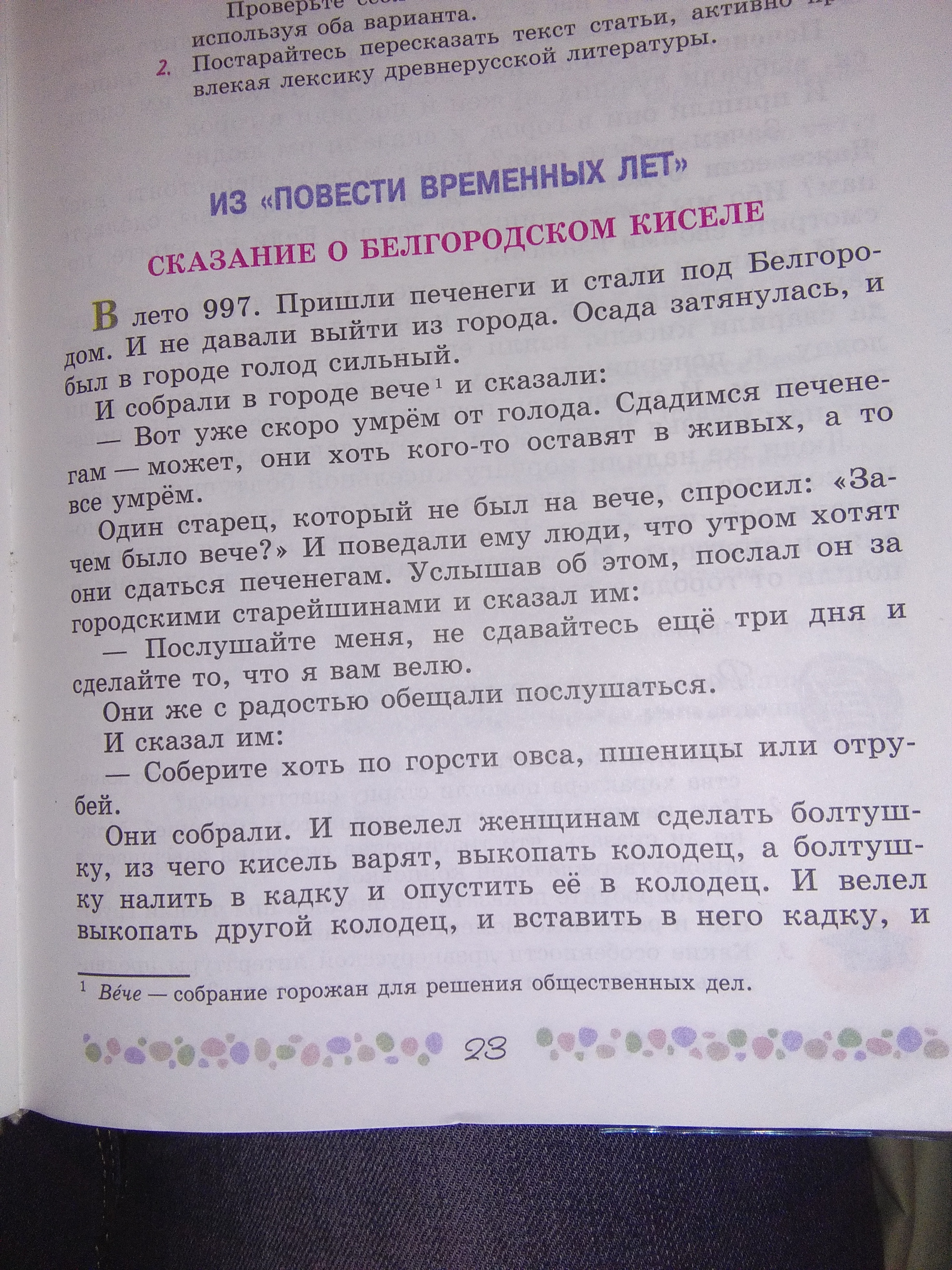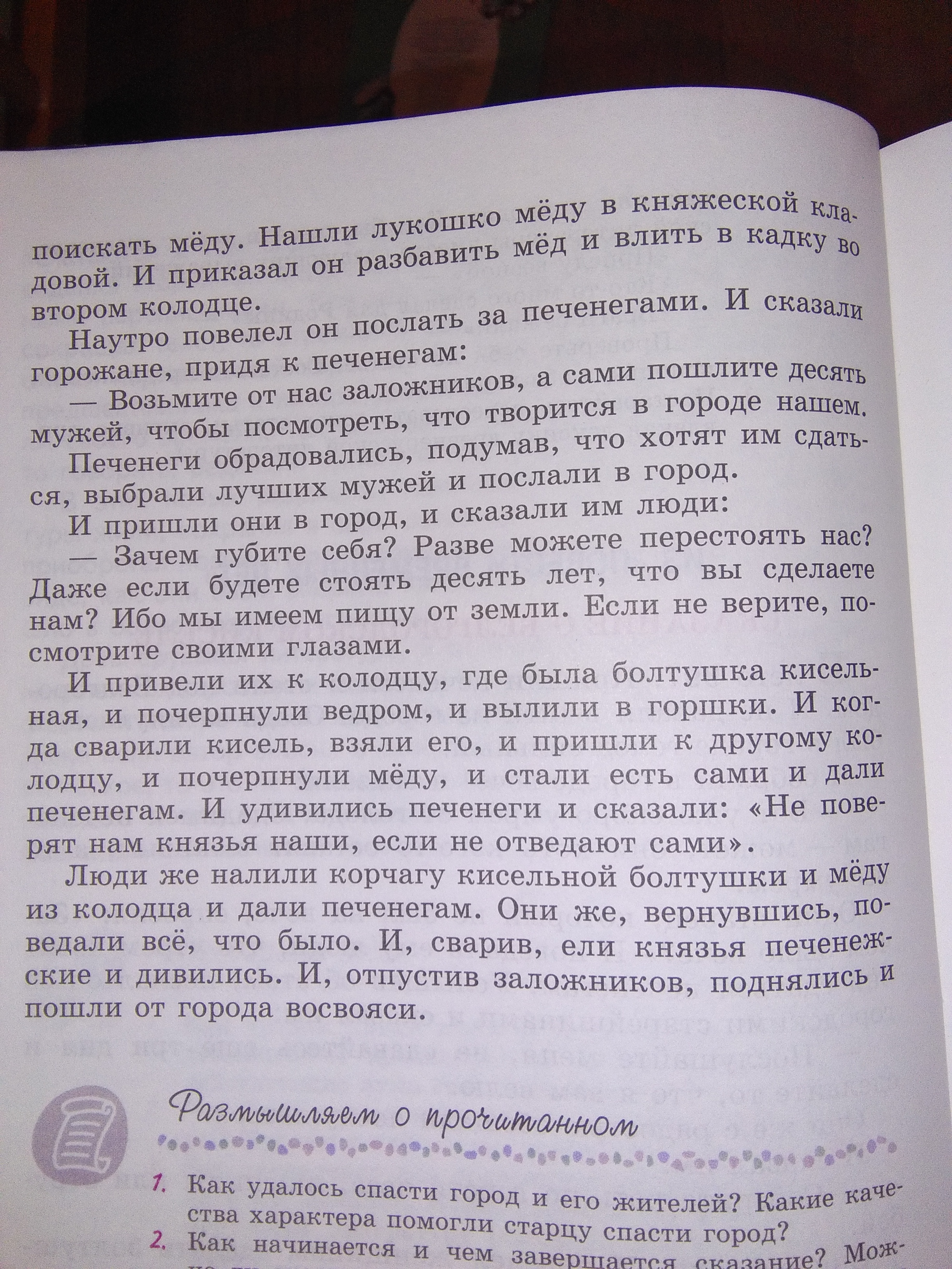 1. Один старец, живший в городе, был находчив, хитер, смекалист. Он своим поступком как бы намекнул печенегам, что белгородцы никогда не сдадутся и еще долго будут оборонять город, потому что стоит он на киселе, который дает им земля русская. Мудрец велел сварить из горсти пшена и овса кисель и взять мед из закормов княжеских. В первый колодец опустили кисель, во второй - мед. Дали отведать врагам.