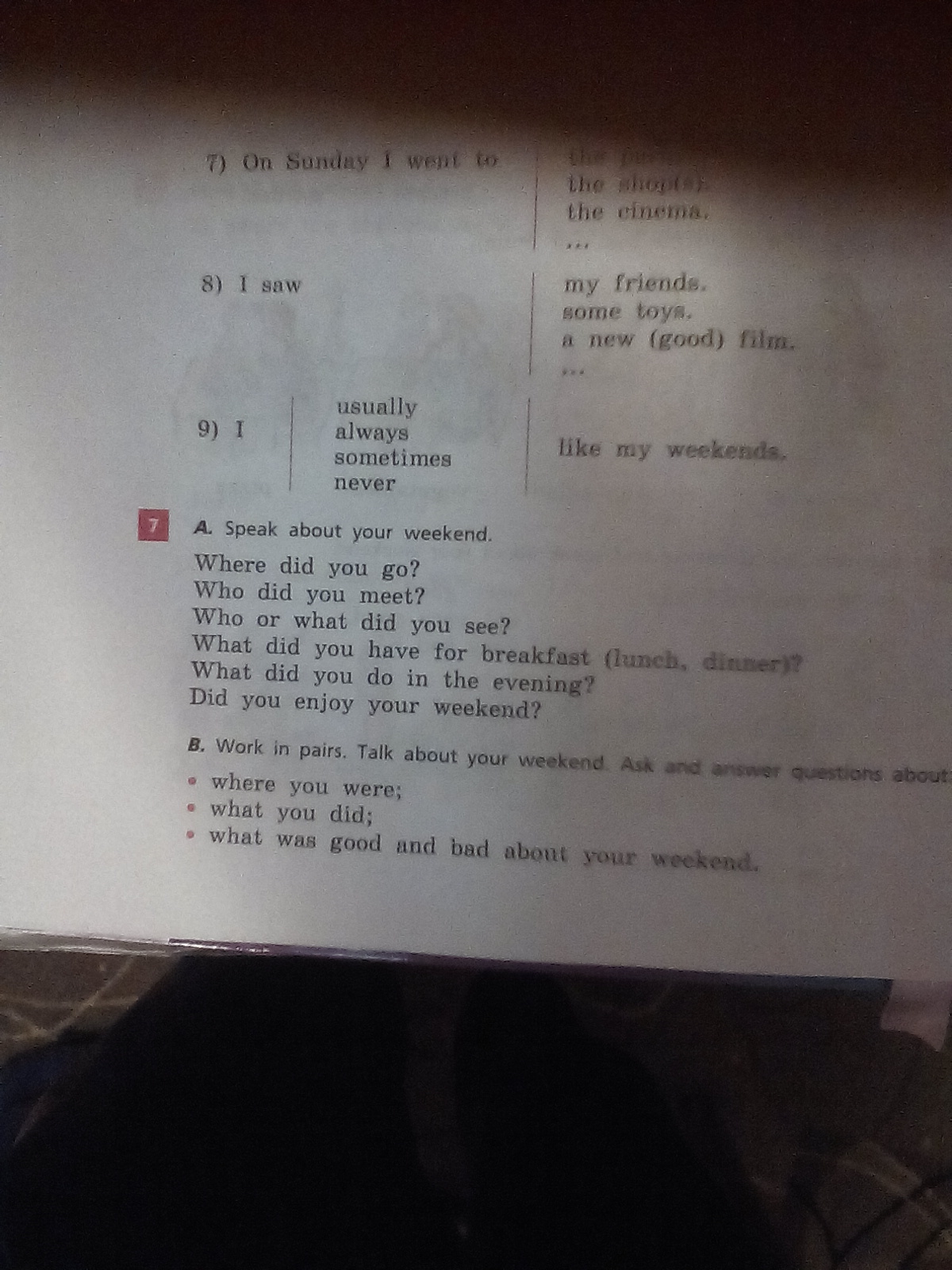 I went to the cinema. I met my friends.I saw a new movie (film).I had coffee,bread and butter for breakfast. I had soup, fish and juice for lunch. I had salad and green tea for dinner.In the evening I watched TV. Yes,I did.I enjoyed my weekend.