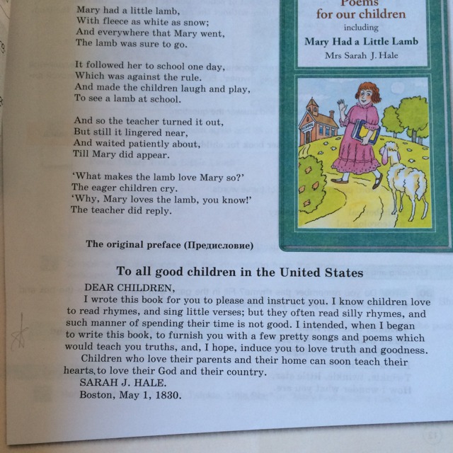 дорогие детиЯ написал эту книгу для вас, чтобы угодить и проинструктировать вас. Я знаю, что дети любят читать стишки и петь маленькие стихи; но они часто читают глупые стишки и такой способ, чтобы тратить свое время не очень хорошо. Я намеревался, когда я начал писать эту книгу, чтобы предоставить вам несколько красивых песен и стихов, которые бы научит вас истины, и я надеюсь, побудит вас любить истину и добро. Дети, которые любят своих родителей и их дом вскоре может научить их сердца, чтобы любить Бога своего и свою страну.САРА J. ОПЗЖБостон 1 мая 1830.