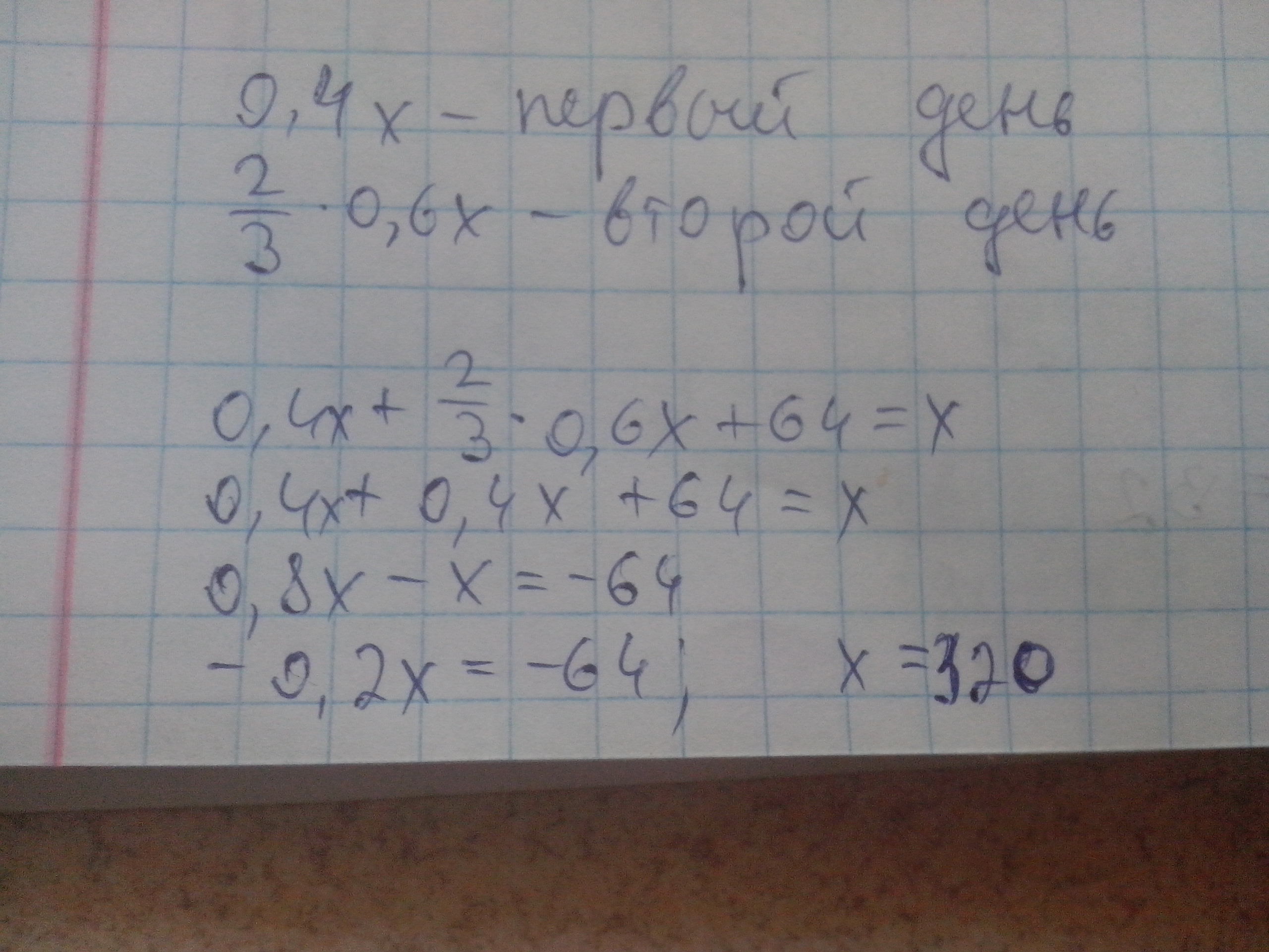 В первый день катя прочитала 40% книги, во второй 2/3 остатка, а в третий оставшиеся 64 страницы. Сколько страниц в книге?