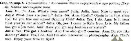 Энн: Привет, я Энн! А тебя как зовут? Джулия: Джулия. Энн: Приятно познакомиться с тобой, Джулия! В каком ты классе? Джулия: 6А. Энн: Правда? Олеся в этом классе тоже. Тебе нравится танцевальный клуб в нашей школе? Джулия: Да, нравится. Энн: Это твой первый год в нашей школе? Джулия: Да. Я переехала в Киев из Львова. У моего папы здесь работа. Энн: У тебя есть браться или сестры? Джулия: Да, у меня есть брат, у меня также есть два двоюродных брата. Энн: Тебе нравится танцевать? Джулия: Да, нравится. Я также заинтересована фотографированием. Энн: Хорошо, наслаждайся Киевом!