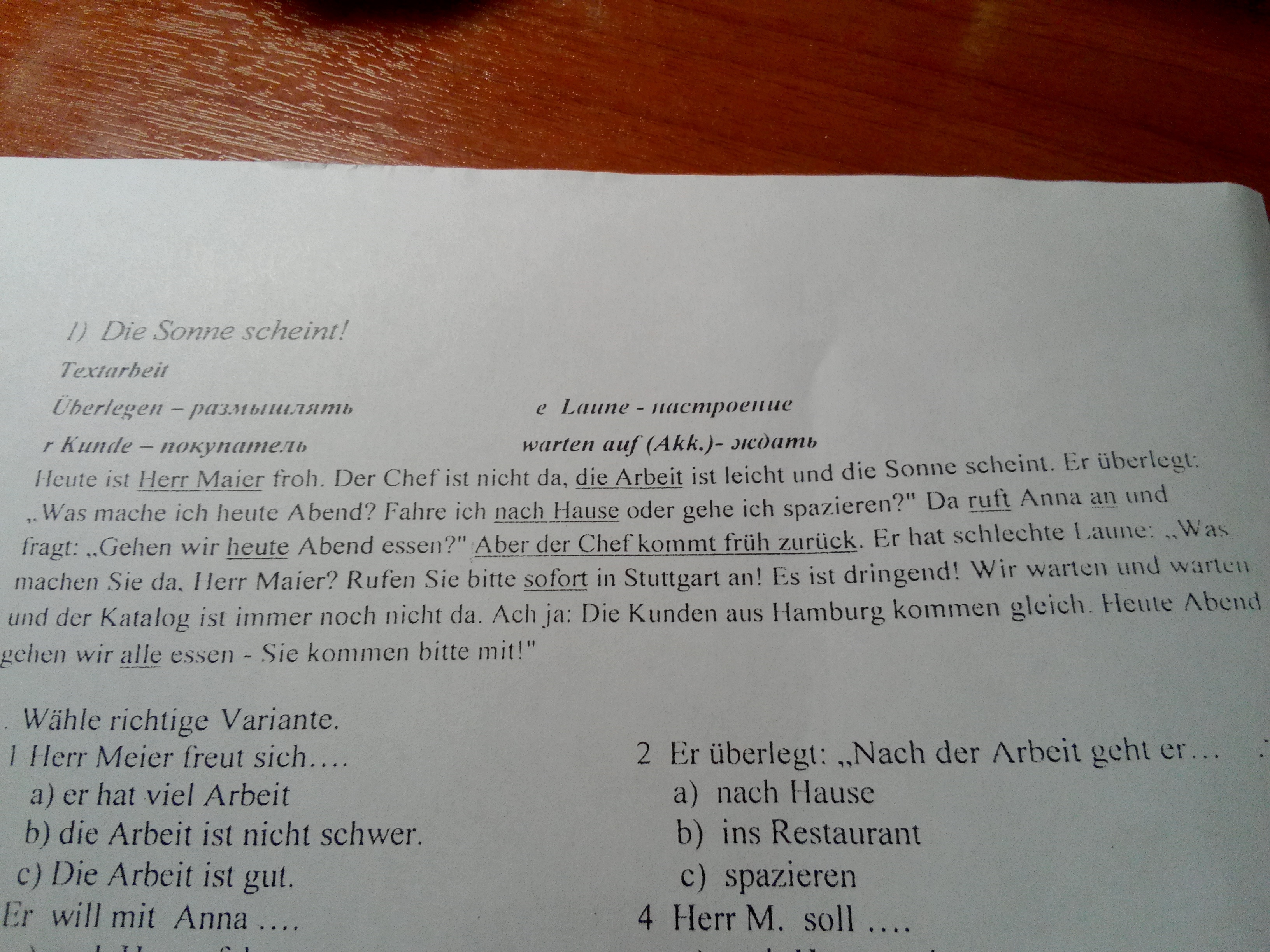 Сегодня господин Майер доволен.Начальник(Шеф) не здесь, работа легка и солнце светит. Он подумал: "Что я делаю сегодня вечером? Я поеду домой или пойду прогуляюсь?". Вдруг его позвала Анна и спросила:"Мы сегодня вечером пойдём кушать?"Но шеф приехал слишком рано. У него было плохое настроение:"Что она здесь делает, господин Майер? Пожалуйста, её зовут немедленно в Штутгард(город Германии)/ Это срочно.Мы ждали и ждали, а каталога всё ещё нет там.Ах да:Подарки из Гамбурга(город Германии) прибудут сразу же. Сегодня вечером мы все идём кушать-пожалуйста, они приедут.