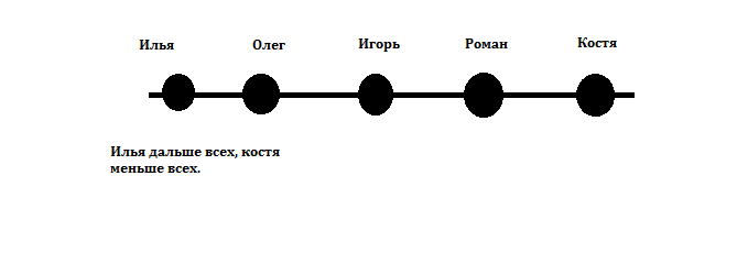 Пять товарищей спускались с горы на санках Игорь проехал дальше Романа но ближе чем олег Костя проехал меньше чем Роман а Илья-дальше Олега, кто из ребят проехал дальше всех а кто меньше всех. ЗАДАЧА ЭТО РЕШИТЕ ПО ДЕЙСТВИЯМ