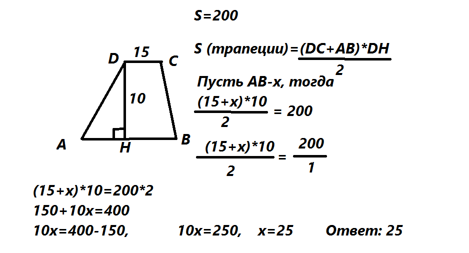 2)Одно из основанийтрапеции равно 15, высота равна 10, а площадь равна 200.Найти второе основание трапеции.- решение этой задачи