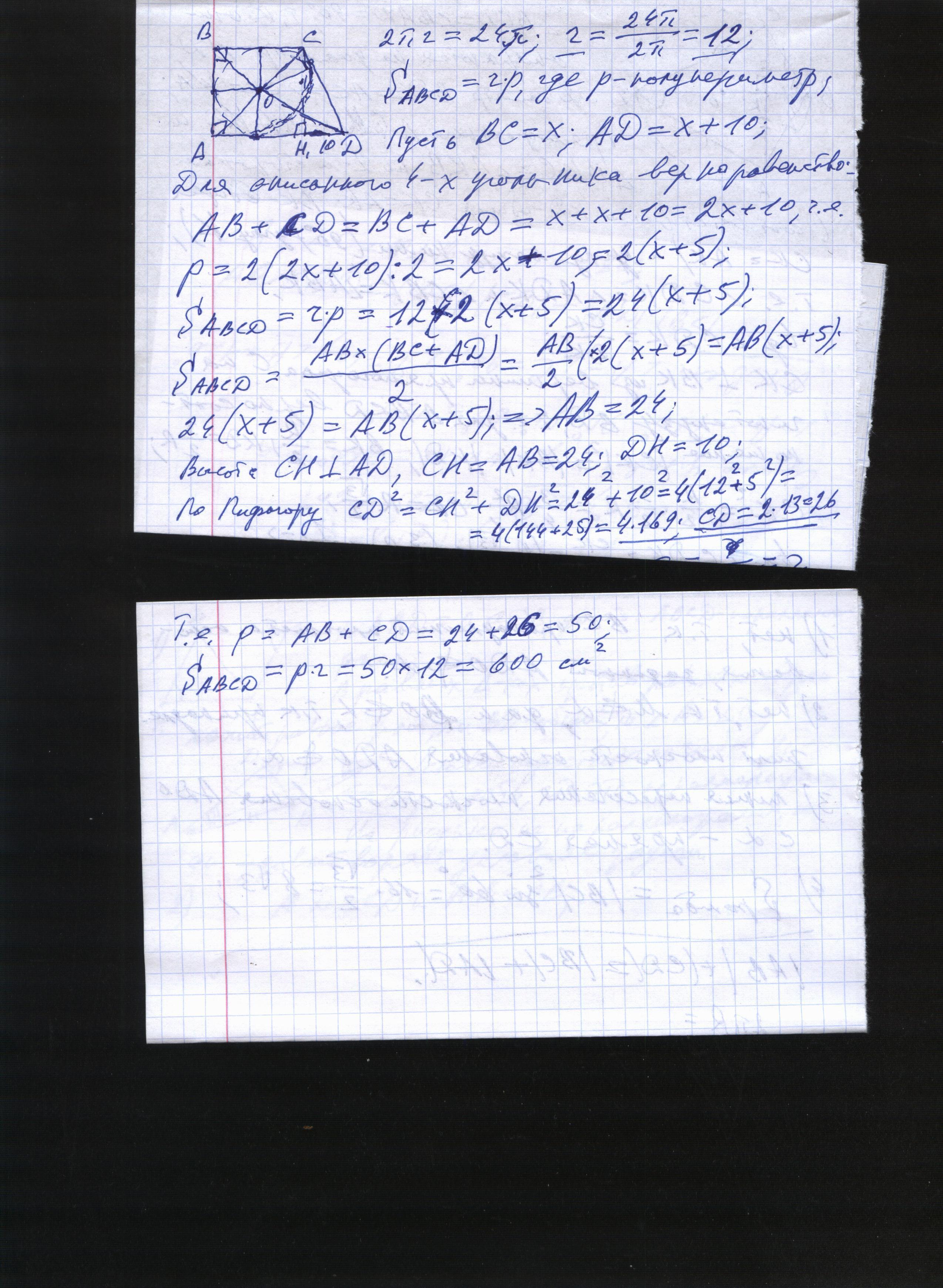 7. Длина круга, вписанного в прямоугольную трапецию, равна 24π см.