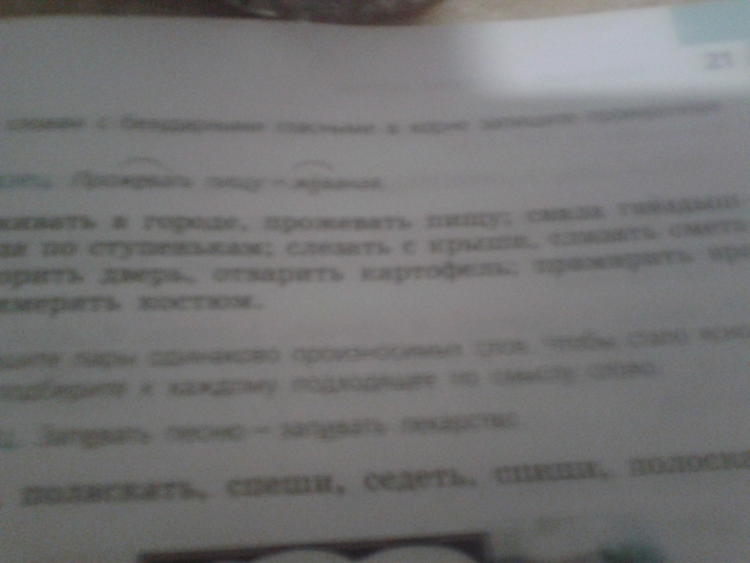 Проживать( жить) в городе, прожевать ( прожёвывать) пищу, свила ( вить ) гнездо, свела ( свёл) по ступенькам, слезать ( слез) с крыши, слизать ( слижет) сметану, отворить дверь ( затвор), отварить ( отвар) картофель, примирить ( мир) врагов, примерять ( примерка) костюм).