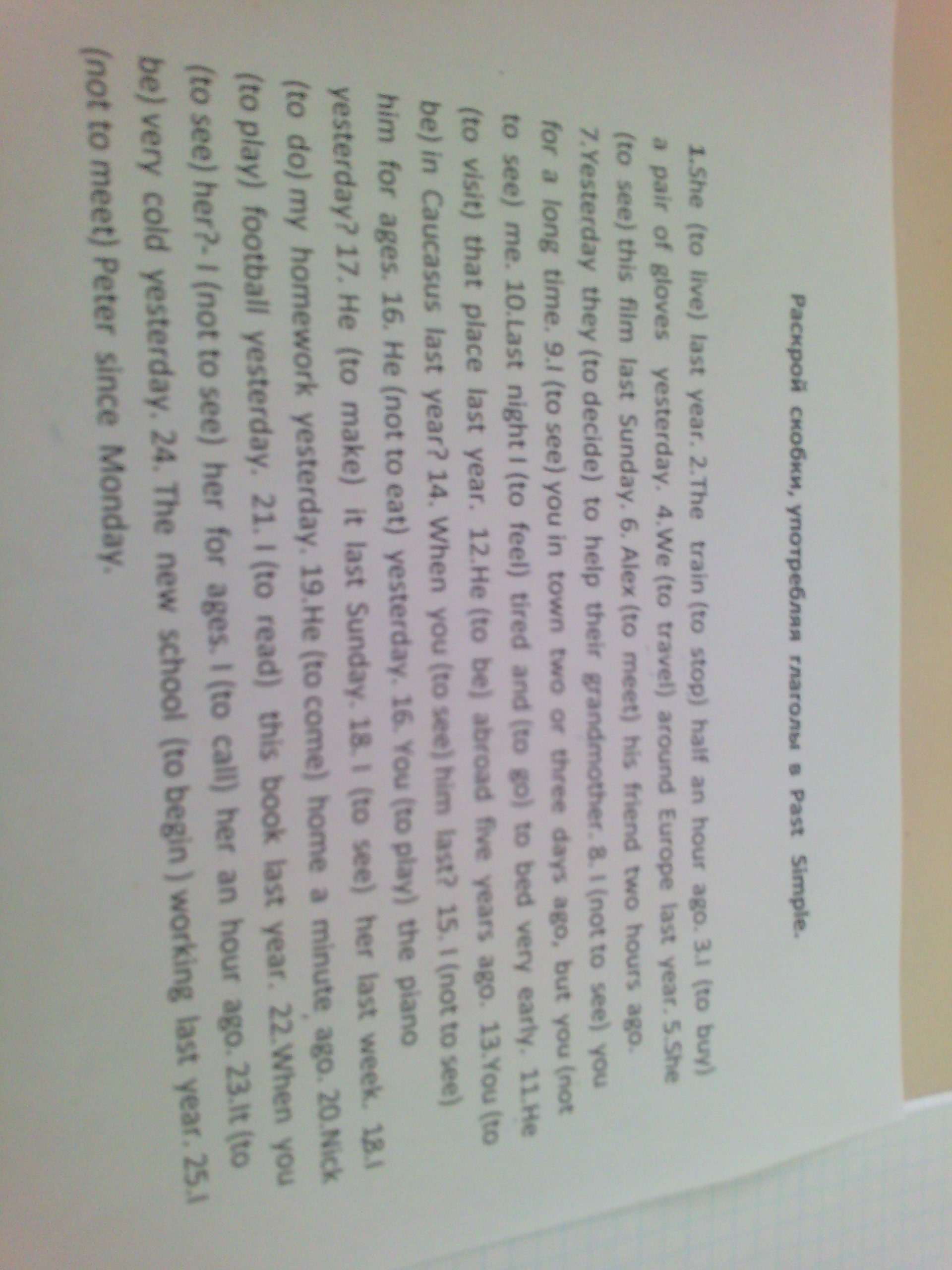 1. Lived 2.stopped 3. bought 4.traveled 5.saw 6.met 7.decided 8.didn't see 9.saw/ didn't see 10.felt 11.visited 12.was 13.were 14.saw 15.didn't see 16.didn't eat 16(2). played 17.made 18.saw 18(2) did 19. came 20played 21read 22saw/didn't see/called 23was 24began 25didn't met
