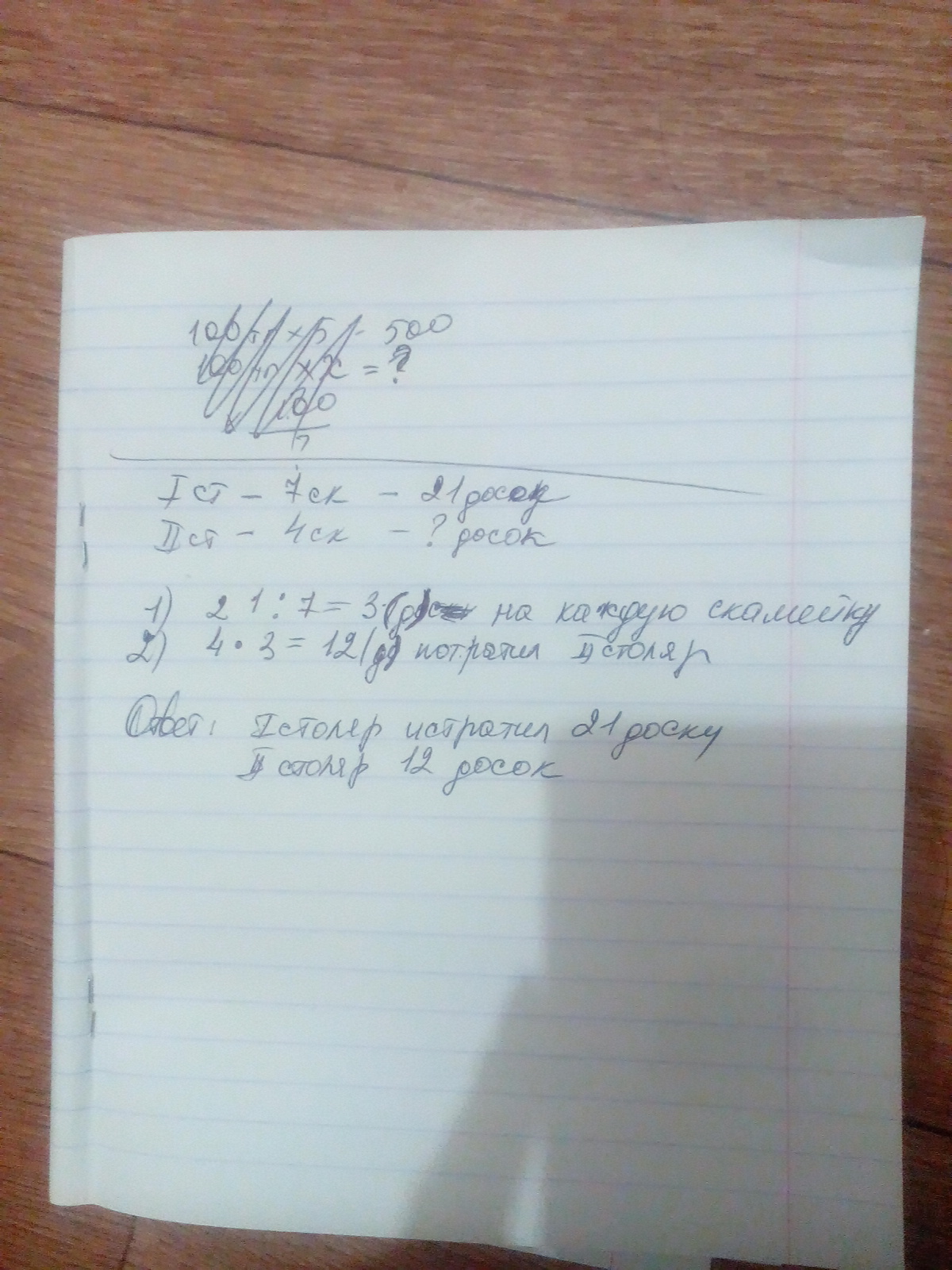 первый столяр сделал 7 скамеек а второй 4 скамейки при этом первый столяр истратил двадцать одну доску больше чем второй Сколько досок истратил каждый столяр