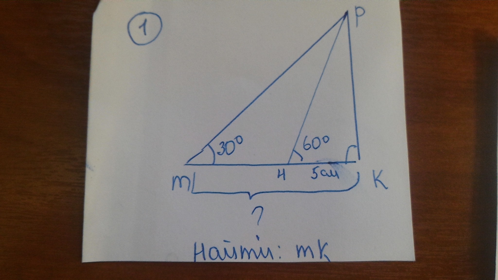 Отсюда MK=PK*ctg(30°)=5√3 см * √3 = 15 см
