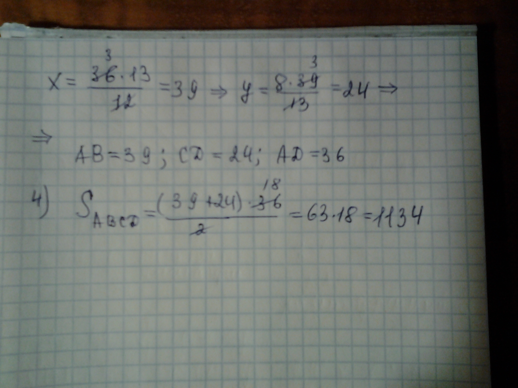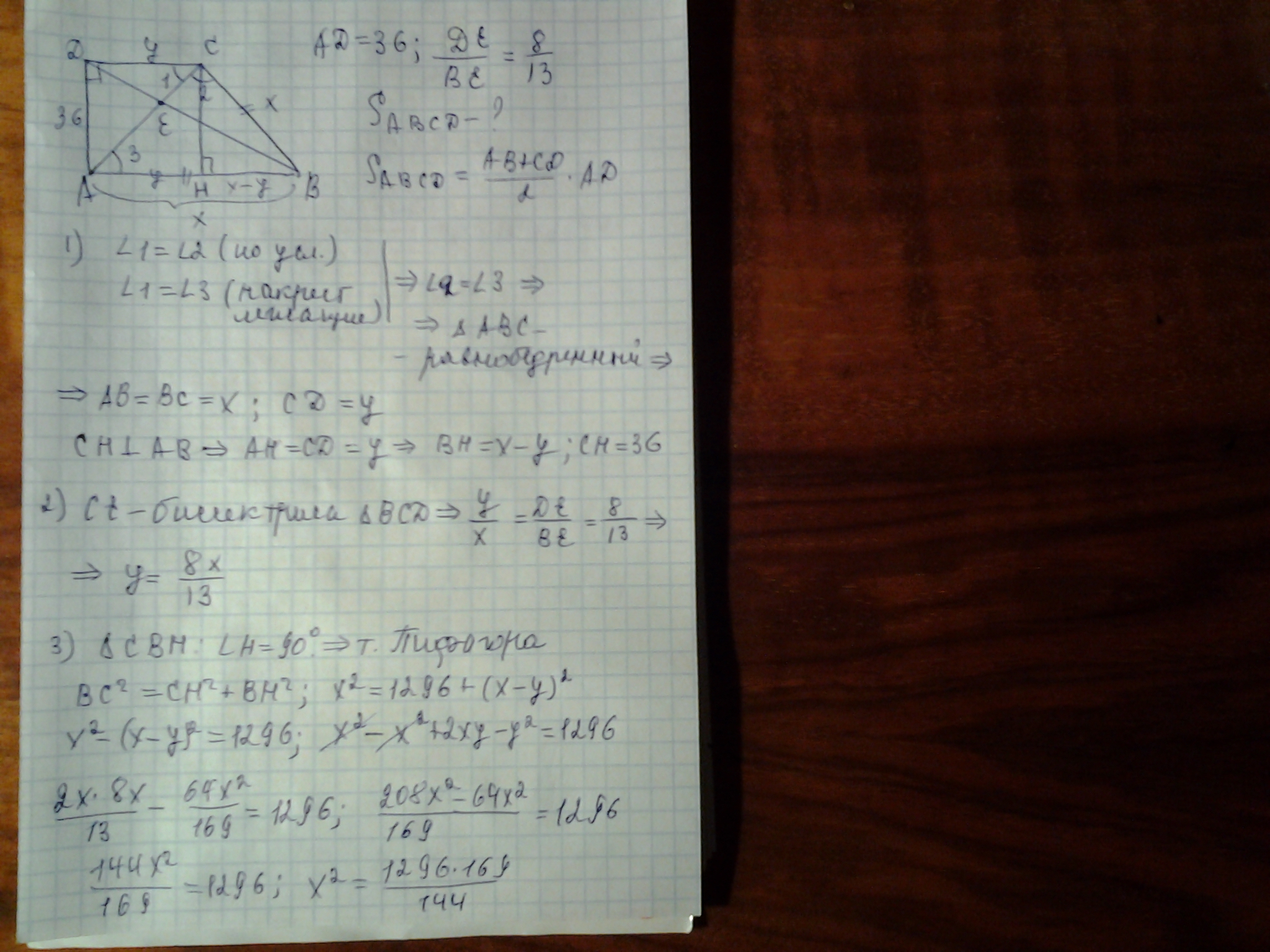 У прямокутній трапеції менша діагональ є бісектрисою тупого кута і ділить другу діагональ на відрізки у відношенні 13:8.Обчислити плщу трапеції,якщо її висота дорівнює 36 см.